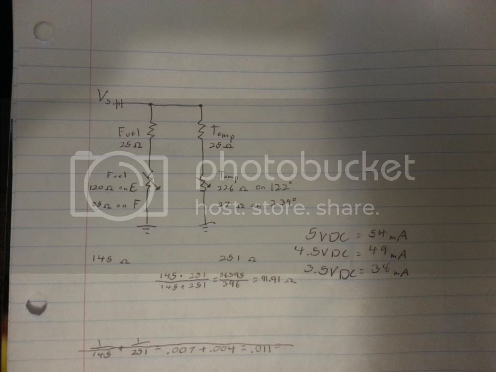 First step was to figure out what I was working with exactly. Our gauges operate by accepting a source voltage that passes through the gauge, through the wire harness, through the sender (which in its most basic form is just a variable resistor) and then to ground. I got out the FSM and scrawled up a rough schematic of the circuit for the fuel and temp gauges based on the resistance values specified.