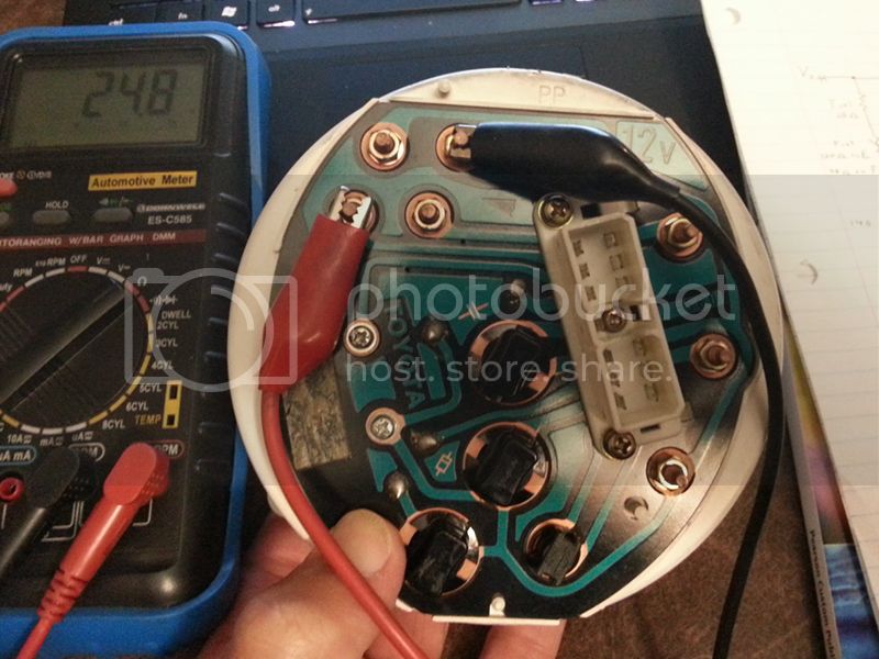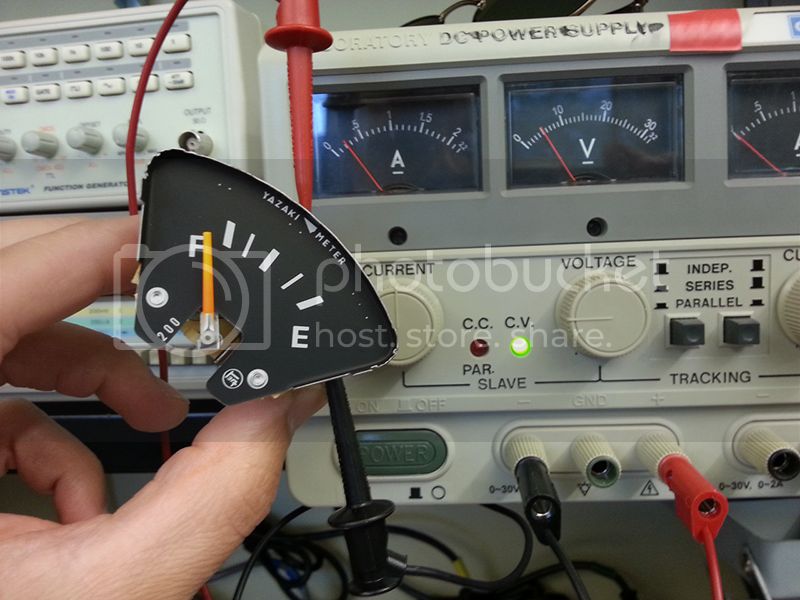 Testing the fuel gauge. You can see my MM reading 24.8 in the pic. It would rapidly bounce between 24.8Ω and 25.0Ω, but using the school's DMM (much more accurate) I was able to take finer readings and got 4,995mΩ, so easily close enough to round to 25Ω.