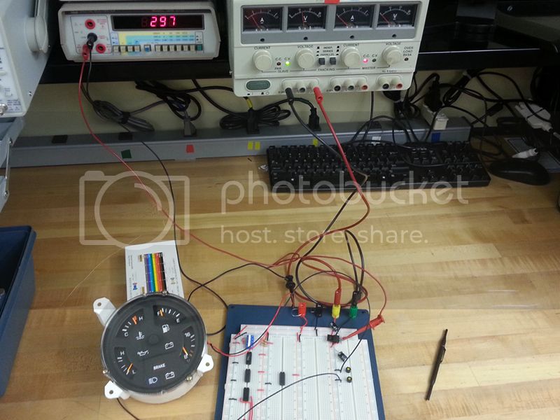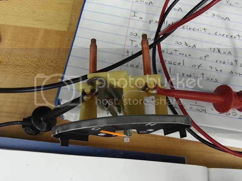 Now had I been smart I would have assumed that the same would be the case for the senders and ohmed out the ground leads for both gauges one of the several times I've already had the dash apart. Next time I tear into it I'll be doing that with a cold engine and an empty fuel tank so that I can record the maximum resistance of both senders and build a better test bed.