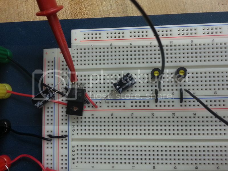 Save for the discrepancy between the FSM's measurement and my actual measurement, everything else seemed kosher. The gauge needles settled in the appropriate spots for the corresponding settings on the pots. Using a small thru-hole breadboard, I soldered a 5VDC linear regulator, three wires and a couple smoothing capacitors into a rough prototype to test in my 62.