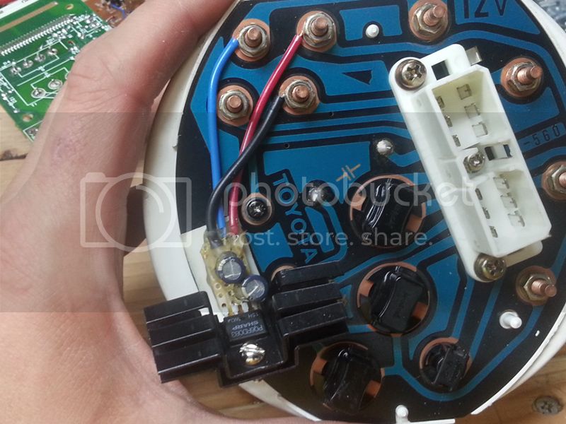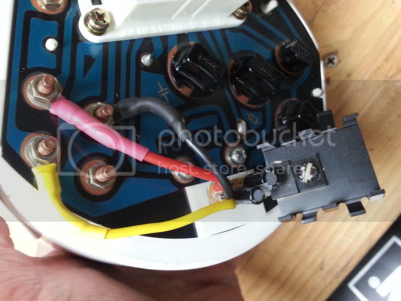 Notice the cumbersome heatsink attached to the regulator. Linear regulators are for the most part inefficient in that they will continue to draw a certain amount of current (depending on the output voltage and maximum output current), but any unused current is dispelled as heat. A simpler way to figure it is that the greater the difference between input and output voltages, the more heat a linear regulator will generate. The benefit is that their output voltage is much more stable than that of a switching regulator, which can make them desirable for sensitive electronics (depending on the application). Not being sure just how sensitive the armatures of the gauges are without the inductor in place (black capacitor-looking part inside the fuel gauge), I opted to err on the safe side as a "just in case" measure.