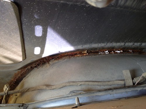 This is what the inside of both wheel wells pretty much look like. The white is just crap in there and not daylight. Actually pushing on the metal it still seems pretty firm (which is why I hope I can salvage it). Once done I plan to paint the interior of the wheel wells with Monstaliner's Chassis Saver or a like product.