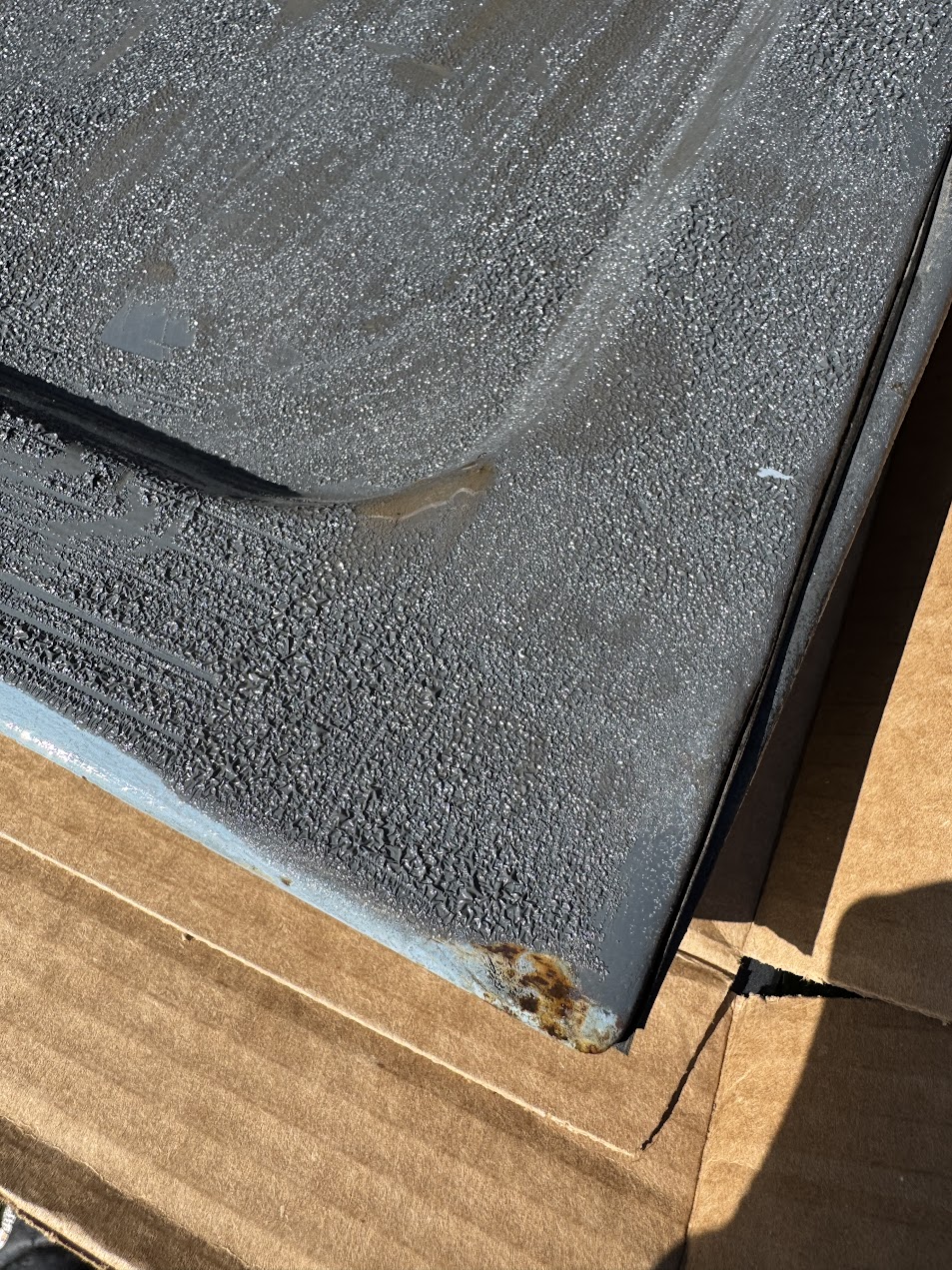 Door looks like this. Can get the tiny stuff off with steel wool and acetone in a quick pass. But the bigger stuff takes a bit of elbow grease to remove.