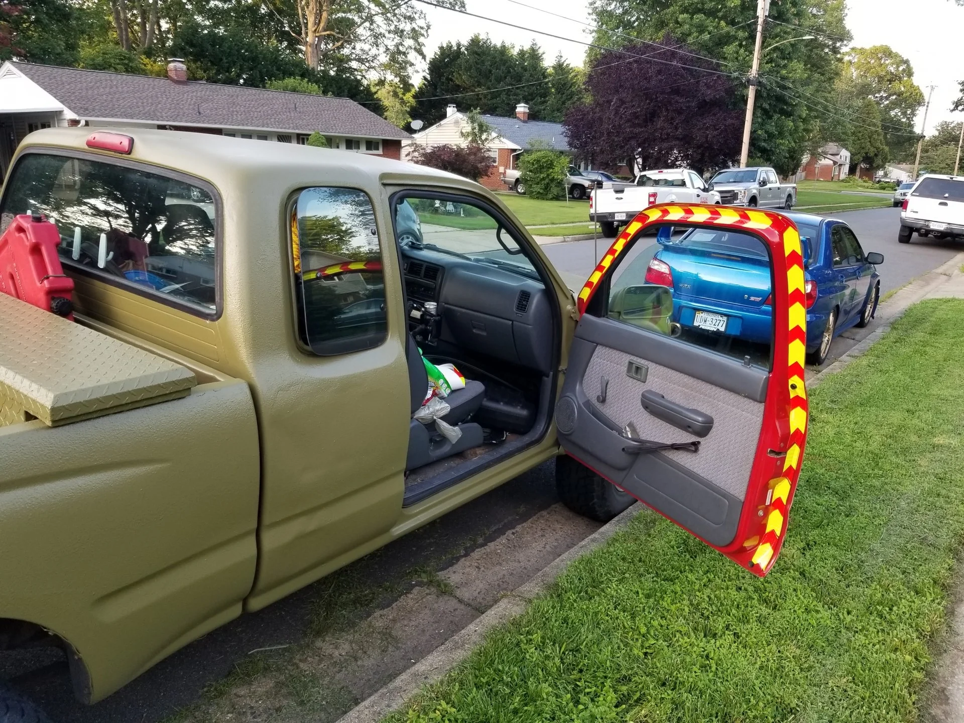 Monstaliner "Sans panties" last week. Made the 2gal kit work. Intentionally didnt paint the inside of the doors so they wouldn't be as camouflaged when they were open. Added some hi-vis safety reflective tape for added effect. I'll do the same for the top inside of the tool box just in case I need to be visible.