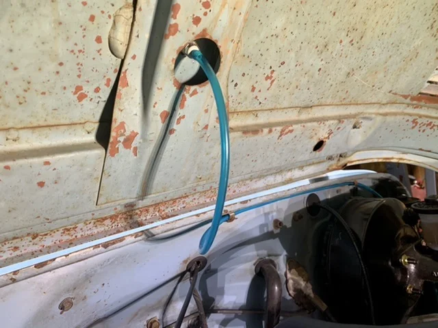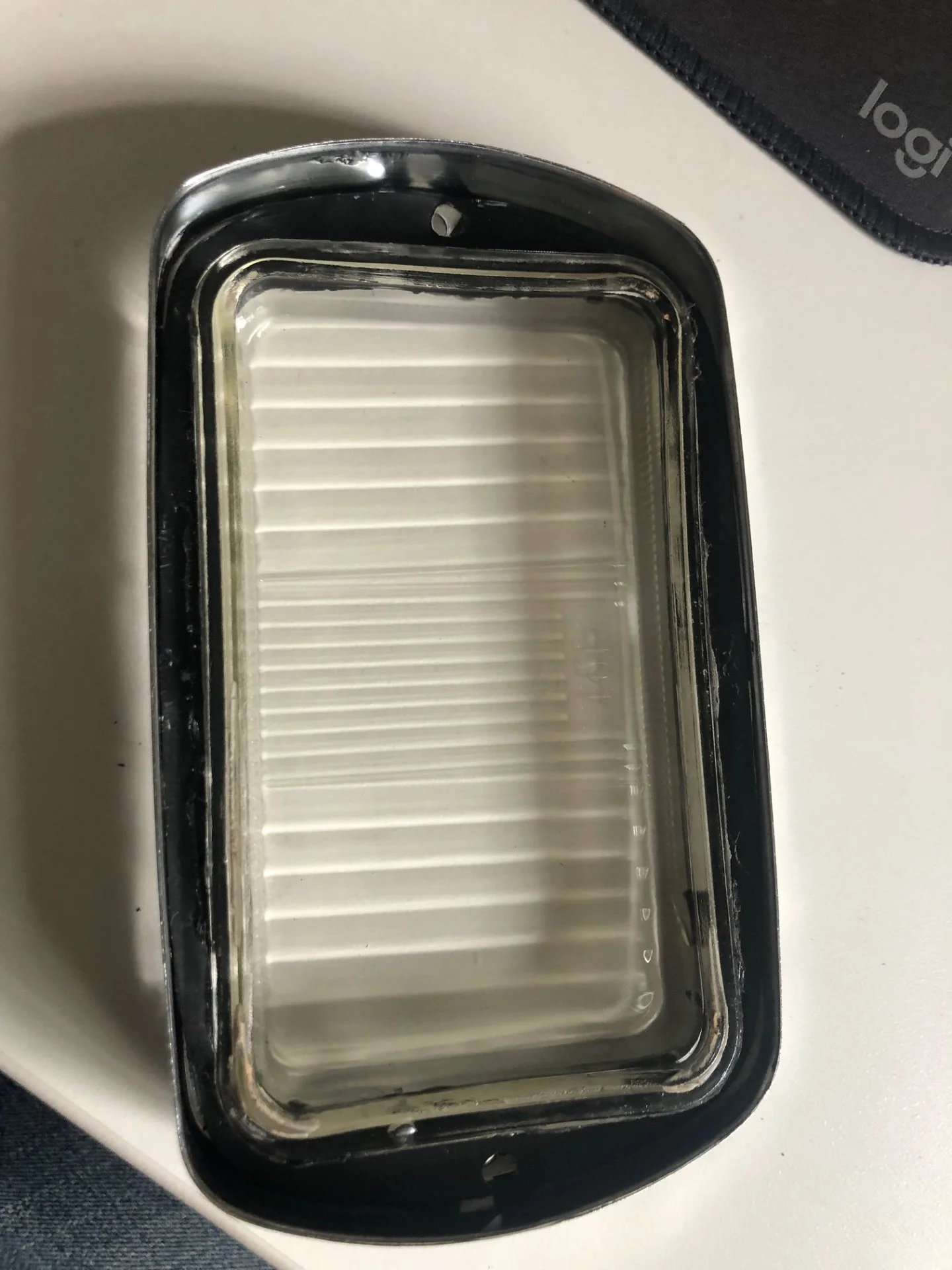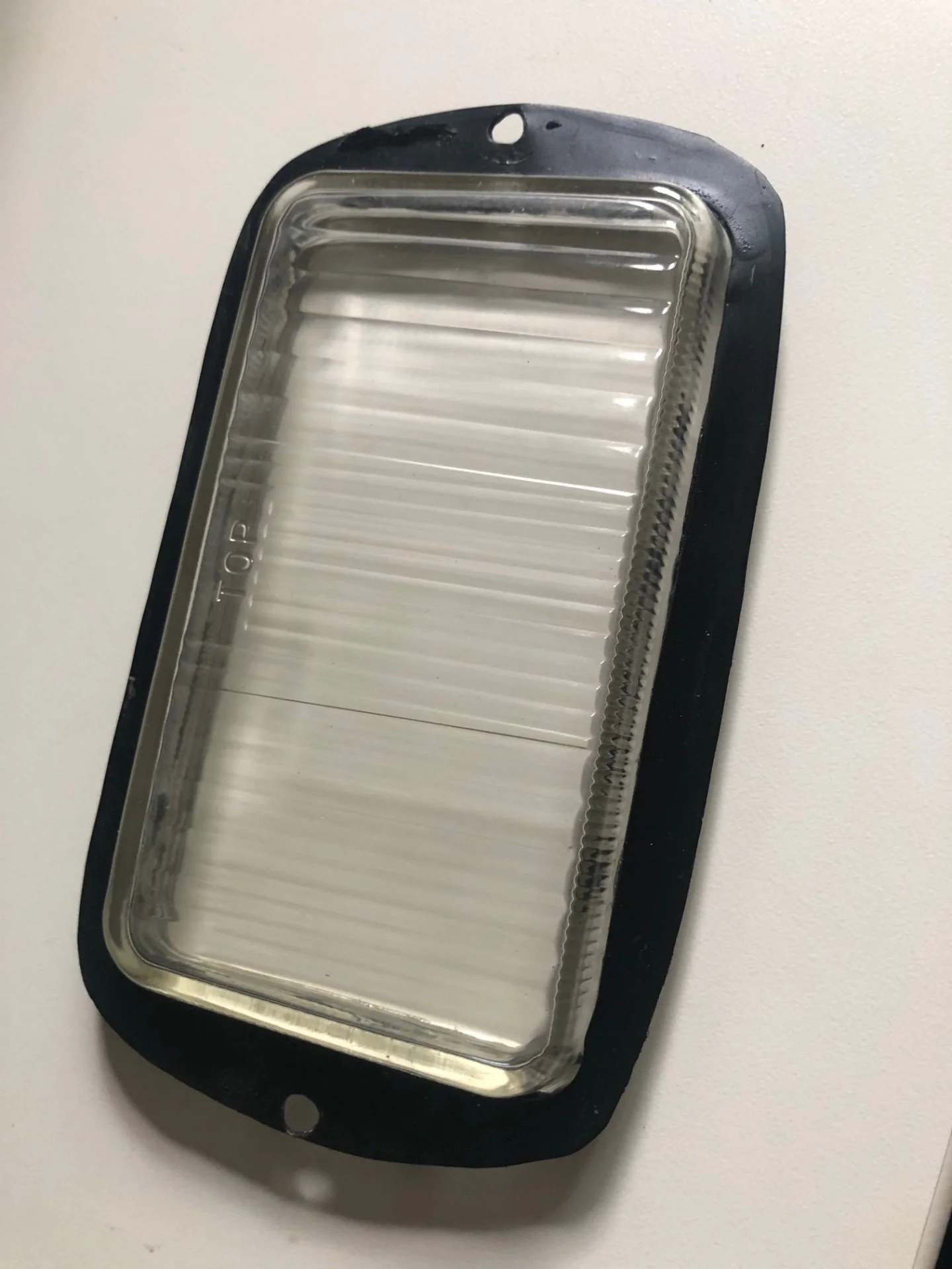Very ingenious, I do have a good piece of original glass. I was making sure everything worked prior to finishing.I'm not sure whether you have the glass for this light. If you don't, I thought I would share what the PO did as a temporary fix. He found a fog light lens that would fit in the housing and made trim piece out of thin metal. This temporary repair has since been replaced with a OEM glass lens.