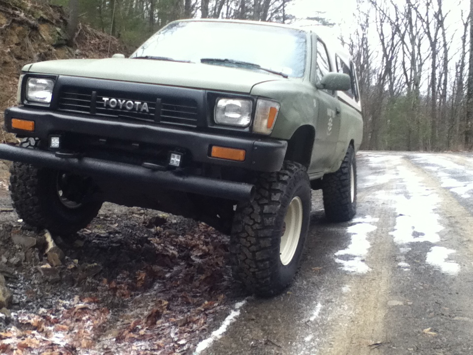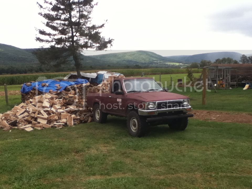 I just thought I would post some work I have been doing on my beater truck. This truck has been beat to death by a family friend since he bough it new. I remember being a kid and seeing this poor truck airborn, swamped in a pond, run into trees, driven drunk, rode hard and put away wet.... Since the early 2000's it has changed hands several times. It has had many different engines and trannys in it. In late 2013 I found the truck out behind a barn being used as a dumpster inside and out....it was sad... sunk into the ground covered in scrap parts waste oil and cow manure. It had no fuel door and the fill neck and tank was full of water and leaves. I convinced the owner to sell it to me for $600 this included an 86 parts truck with a perfect running well maintained 22r and tranny....And a title. I towed them home and started working on it. Several hours with a shop vac pressure washer and cleaning out rats nests and dead rats....I had something that resembled a truck. I took me about a week to clean the carb and tank, change fluids. I got the truck running. The 22re that had been in the truck had a huge hole in the side of the block from being driven at 70 mph on a long road trip after the engine had been locked up from the Previous owner driving into a 4' deep mud hole. there was more water than oil in the pan. Needless to say the sweet running 22r from the 86 truck was dropped in. The 22re harness and ecu was messed up anyway so now things are simplified and it runs great. I fixed all the bugs and drove the truck for two years to haul firewood. I cut about 20 yota loads every summer. Its about a 10 mile round trip each load and the little truck worked flawlessly... At the end of wood season this year the truck needed attention. The rear end was leaking on the brakes and the body had a bunch of problems (too many crashes) and a laundry list of other problems. So I fixed all the major problems and painted it olive drab. This truck had little rust and the frame is in excellent shape so I figured it was worth fixing. I didn't use any bondo on the dents. I fixed any rust or structural issues but left the dents. I love the wrinkled panels. they tell the story of the truck.....sort of like wrinkles on an old weathered face. I did a bunch of mush needed maintenance and electrical work.....then My produce guy gave me a nice fiberglass cap for free....I love running a cap in the winter even if it looks like "an old man truck" as my wife would say. Here is what the truck looked like after I got it running and was hauling wood with it. Sadly I dont have a pics of it the day I picked it up.