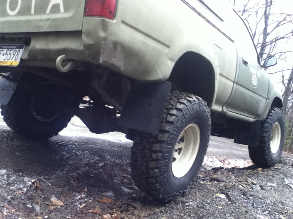Last week I got some BJ spacers and installed them.... I also used some leaves from a spare set of yj springs to make a lift in the rear... I got a total of 3" I still need to fix the alignment and some other things but Its getting there. My new tires will be getting here tomorrow. as well as a new fuel pump, radio and speakers. I will post pictures when I get them. I am going to be running Dick Cepek Extreme country 33 10.50 15's and i cleaned and painted an old set of 15x8 wagon wheels. I would love to keep the wheels i have on the truck now but since I did the BJ spacer the tires are majorly rubbing the UCA. The new wheels have 3.75 backspacing and give the tire lots more room. Here are some before and afters of the lift.