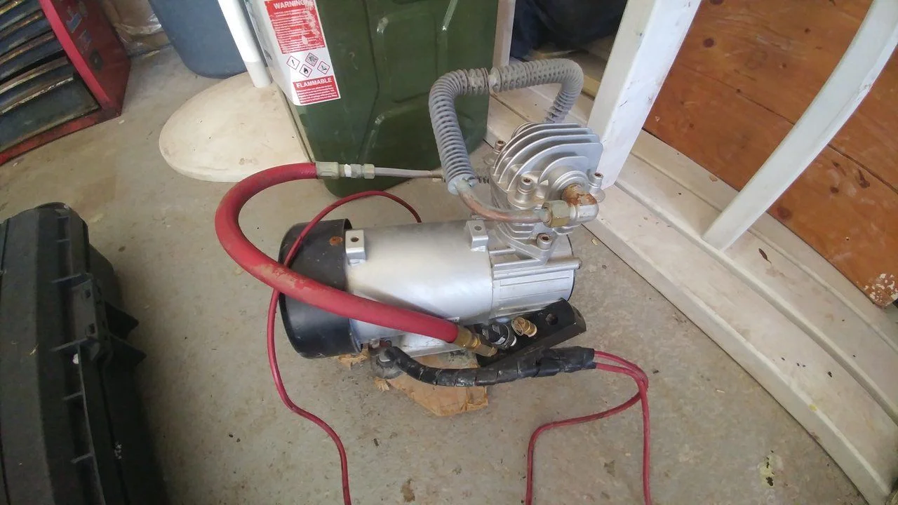 It's got some custom copper that I think I can replace with braided line. I'm going to get a small-ish tank (2 gal? hoping to run horns eventually), and mount the compressor under the hood with the tank under the bed (2nd gen Tacoma).