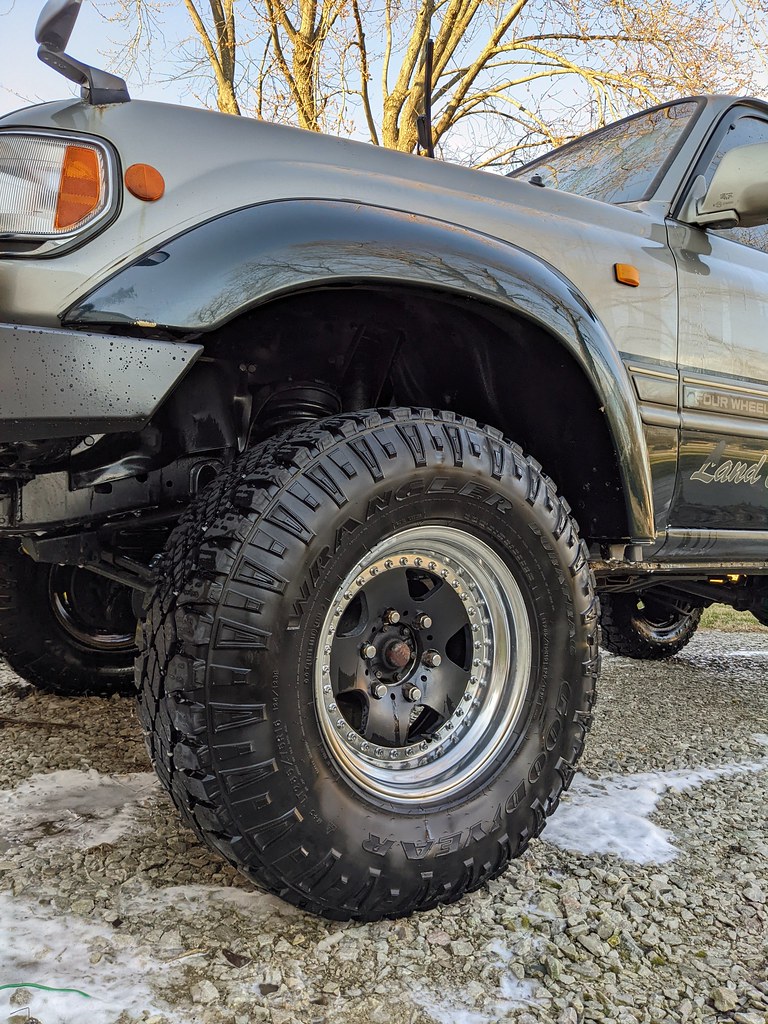 I’d be happy to take glamour shots!The new wheels are Black Rhino Stadiums, I wanted to move up to 17,s to get specific tires which are Toyo AT III 255x80x17. The wheels are 9" wide which are a bit wide but with about 10,000 miles on them, they work good. No pics until I find a supermodel to operate technical devices, or maybe Spenser.