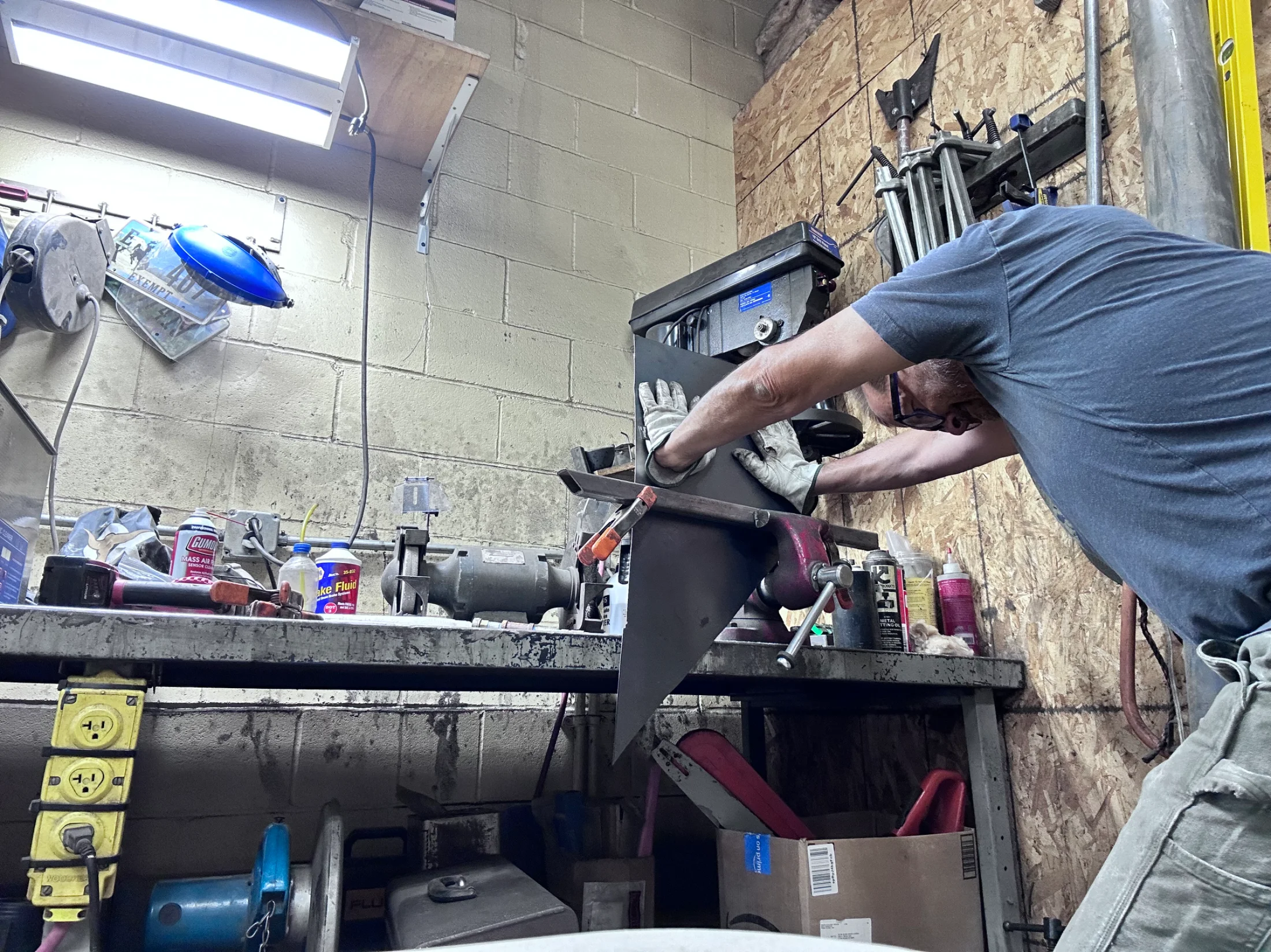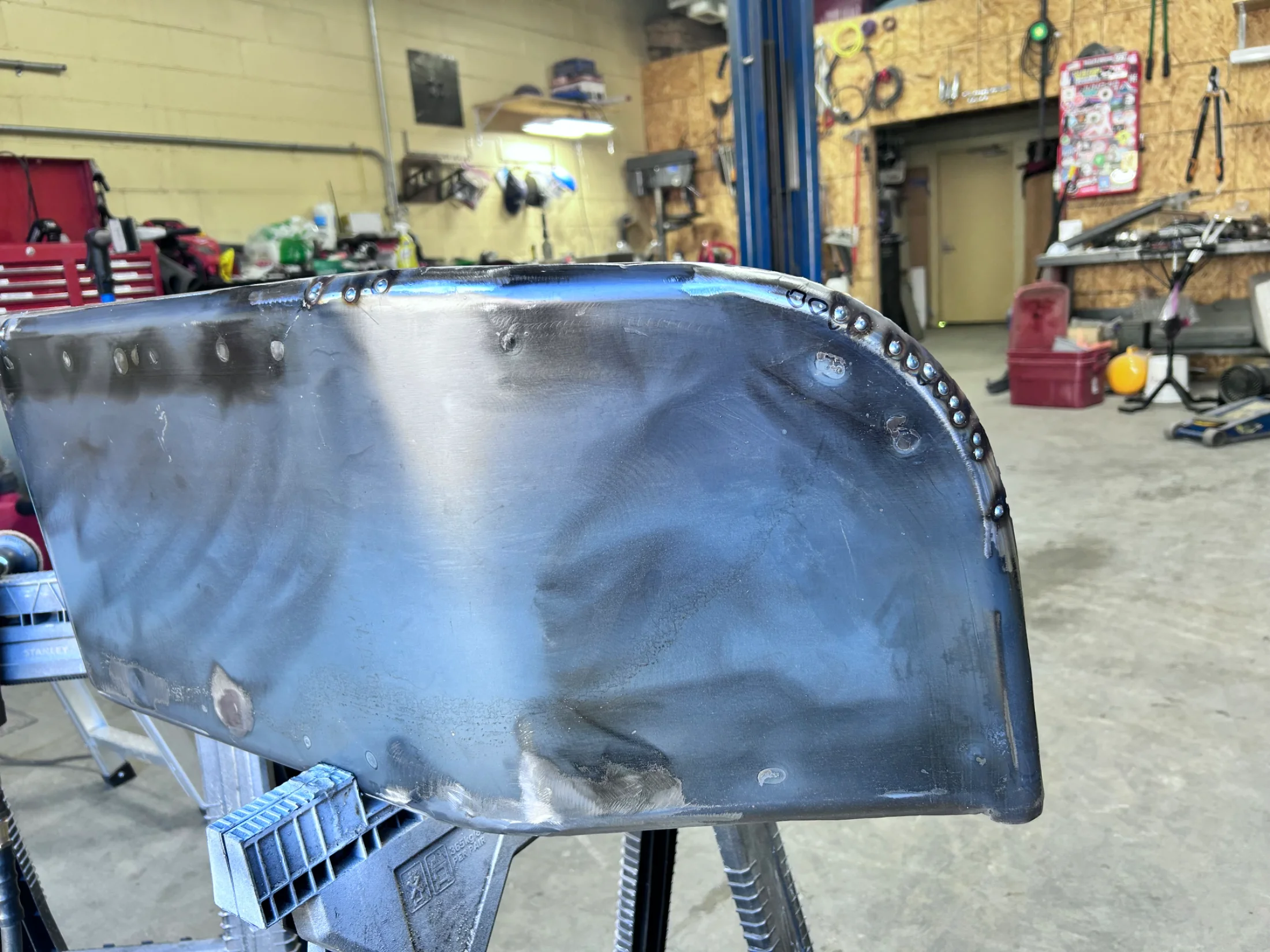 View attachment 3963046Flap wheels and rollocks followed in order to get them presentable. Once I felt like I had plateaued in my skill set, I decided to move onto the inner fender. I used the usual CAD method to find the correct shape of the panels. Then I traced the cardboard pattern to the 16 gauge sheetmetal. Milwaukee nibbled for the win. Since the inner fender is not a flat panel, I had to get creative to make the bends. I give you the ten finger brake. View attachment 3963049