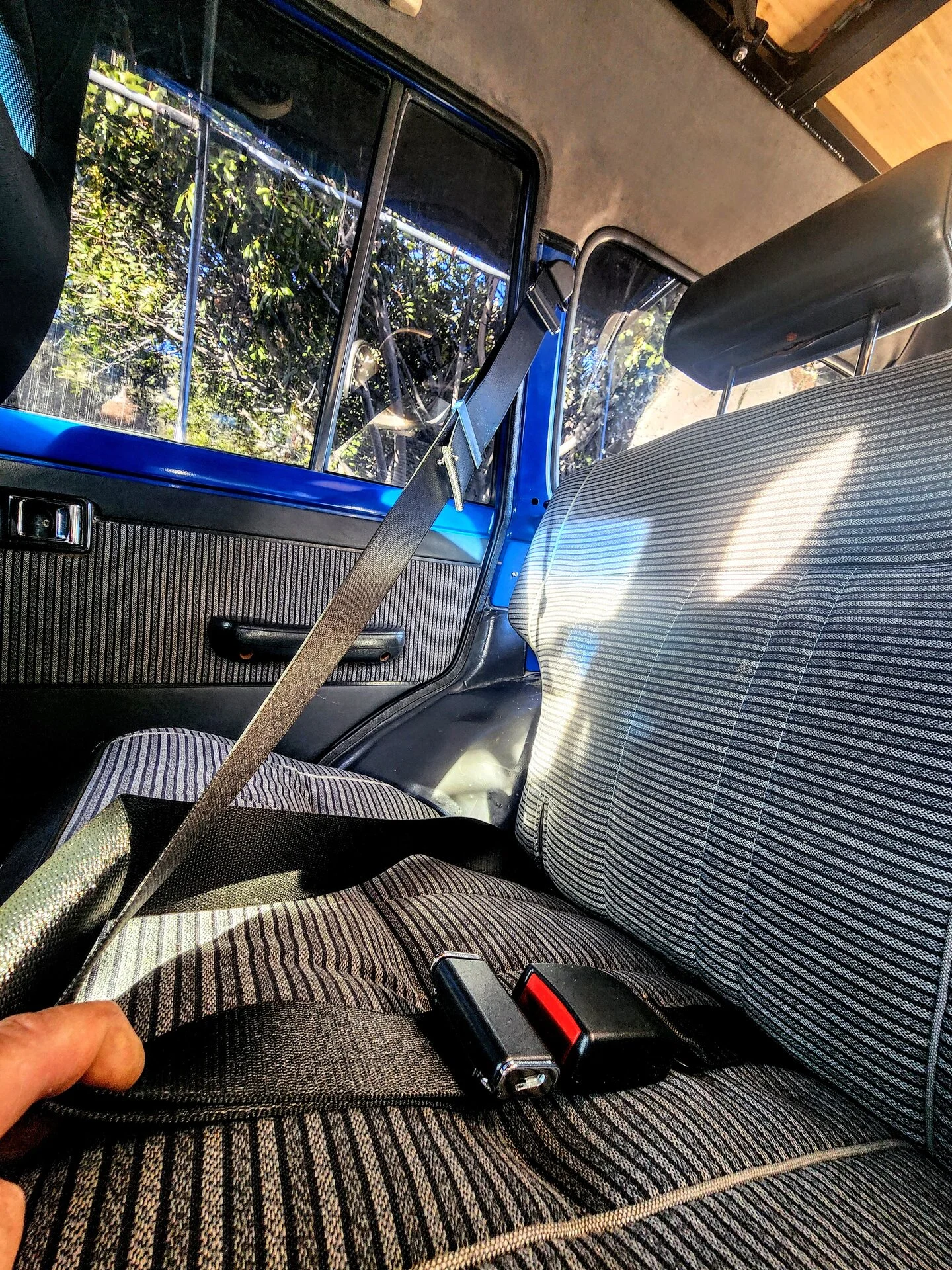 A brief explanation: I bought this car and it didn't have any rear seats installed, so I went and bought some *pristine* full bench seats off an old wrecking one. This was from an '85 year model, but the seats still fit just fine.
