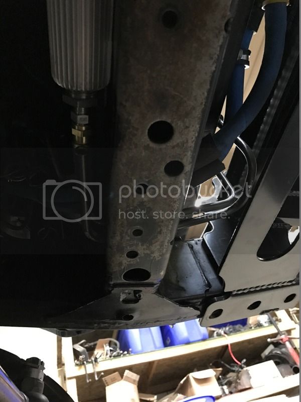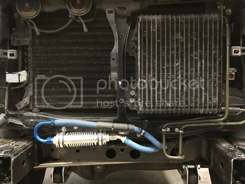Bottom shot you can see the additional cooler mounted to the back of the front cross member, and you can see that both lines go through the same factory through hole…