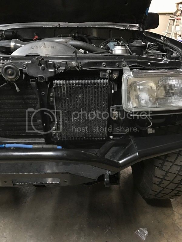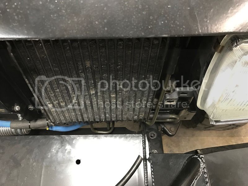 Straightened the fins on the transmission cooler (had to remove the metal in a few spots), then shot in solvent and forced it out with compressed air. Kept repeating the process until the cooler had nothing but clean air coming out. Remounted the cooler and started looking at places to pass trans cooler lines.