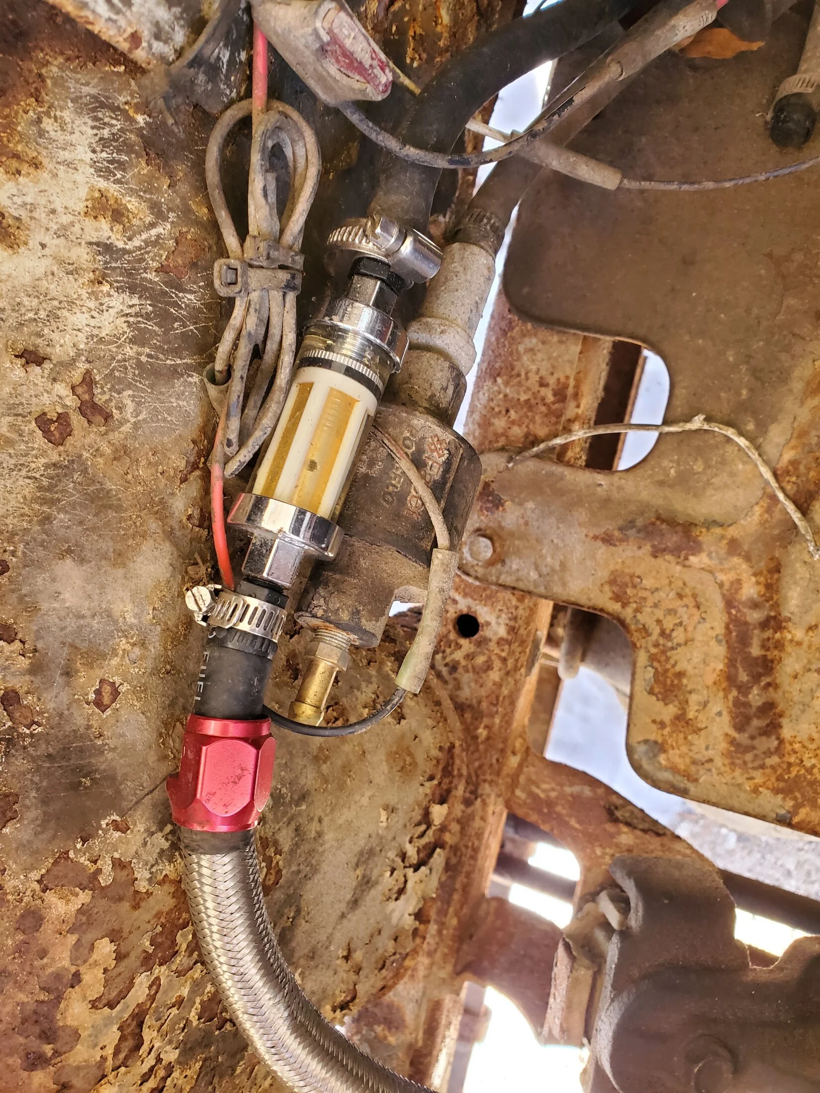 I find this broke in half it goes from positive across firewall under dash somewhere. I gets my electrical connectors (electrical tape 😳😉.) and makes a strong connection. The 🐷🔥s right up. So i moves it 🐖👈 Ford. Then i tries da Projection lamps 👀 da all good to go. Moving on to the fuel. The pump is leaking at the barbed fitting and was'nt before. I did seal 1 fitting and the 1 that's leaking now is the 1 that did'nt. View attachment 3825916