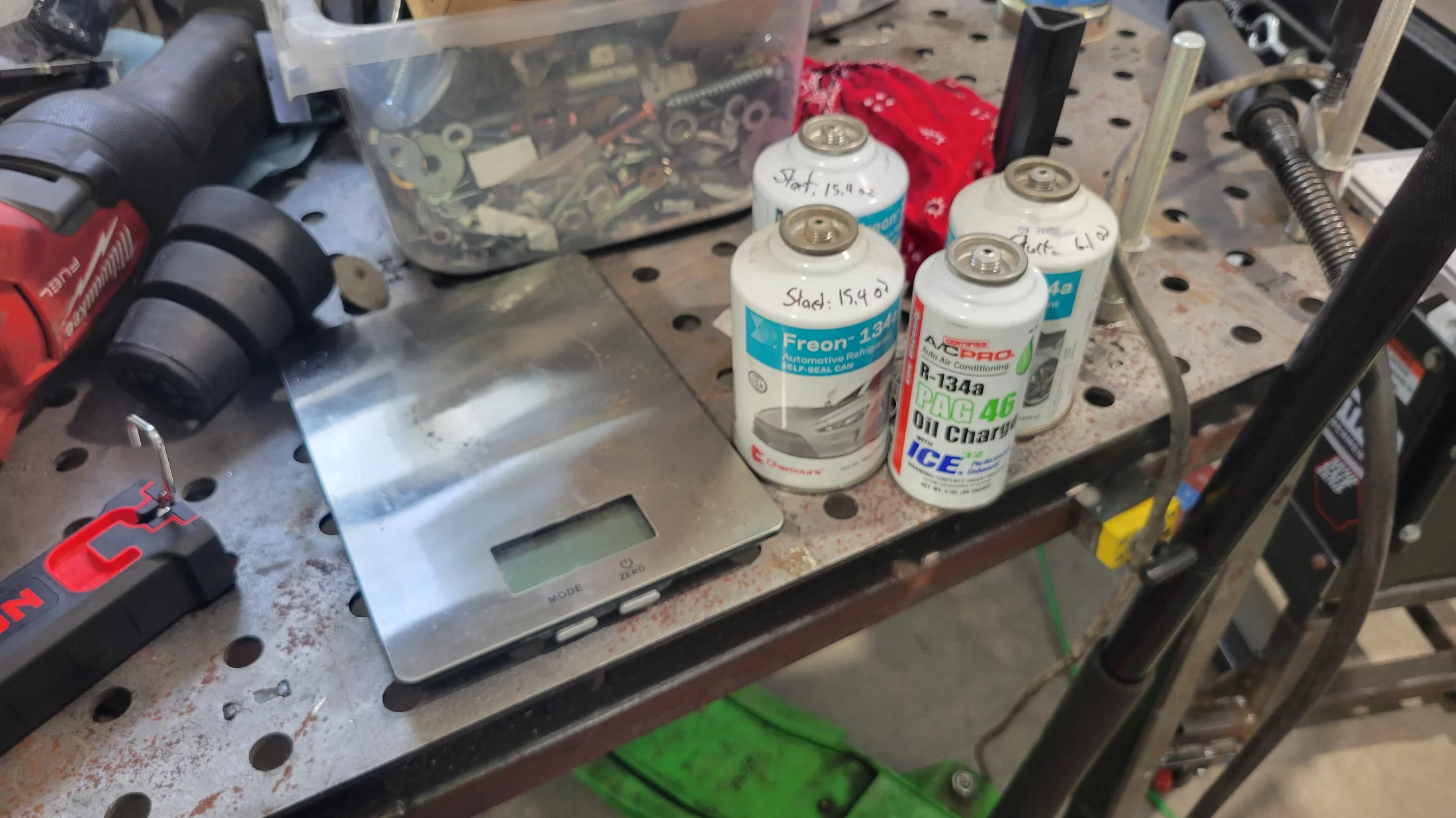 ^Getting ready to charge. I'm going to add 1 ounce of PAG 46 (since this is the 2nd time it's lost refrigerant, it probably has also lost some oil), one 12-ounce can of UV-dyed R134A (expensive at $32/can), and fill out the remaining 23 ounces with non-dyed R134A. I use a kitchen scale to weigh the cans and make sure I get close to the required 23 ounces in the system.