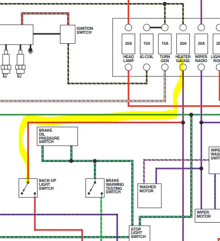 Now that I've had a chance to hear the engine run, I'm digging into the electrical a bit. As mentioned above, the electrical system has been thoroughly messed with, and whatever stock wiring is left is dirty and corroded. I had to emery cloth the fuse box twice to get continuity across some of the fuses - there's just such a heavy layer of corrosion on the contacts.