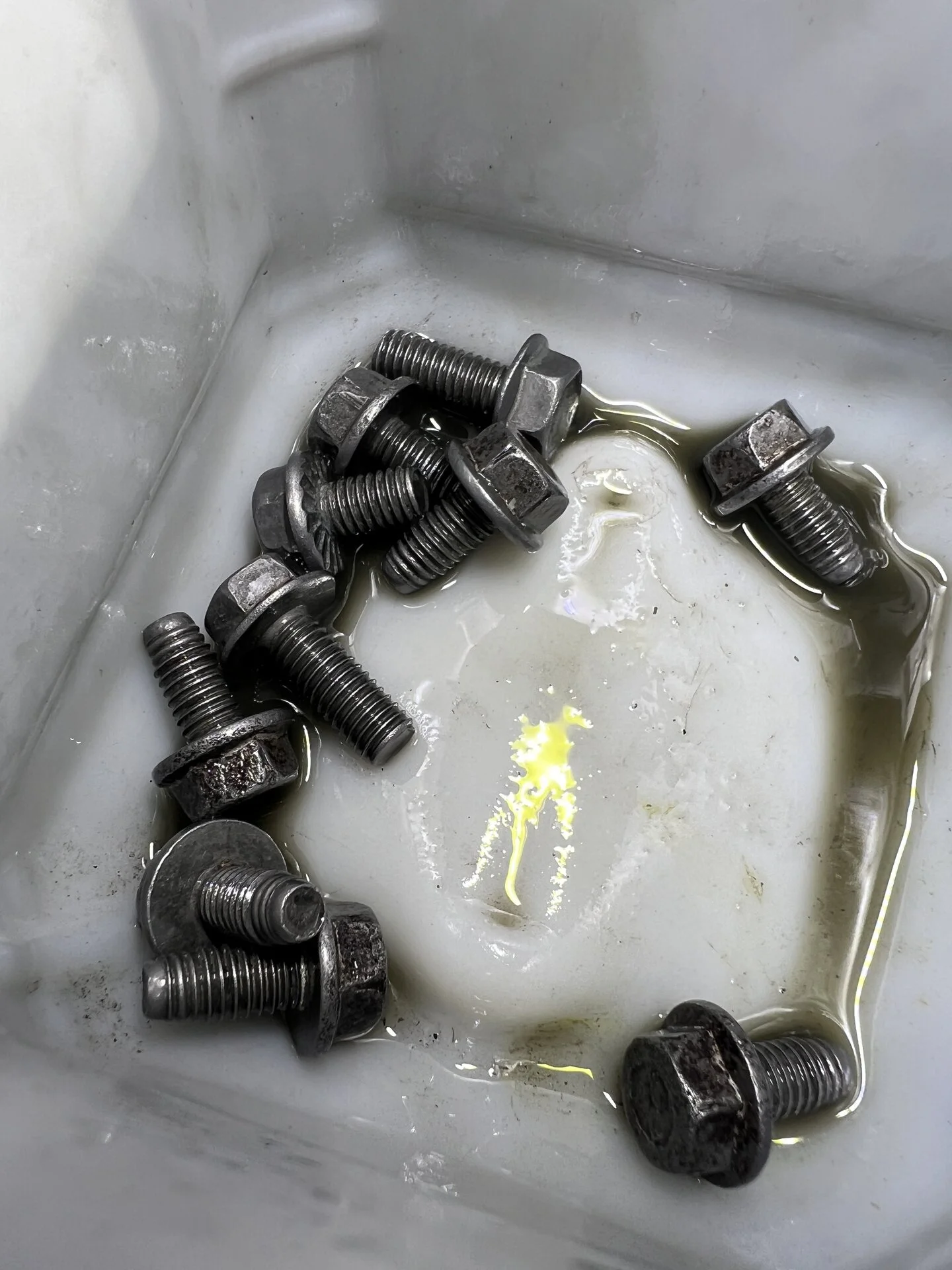I keep a recycle bin for my little bits (best British accent) and clean up the threads, wash and keep handy. Can you tell me which bolt I stole off new Toyota, which is @overlandmetric and @ToyotaMatt (last photo). As you probably know these looks so nasty when removed, let soak awhile and they are back to beautiful gray.