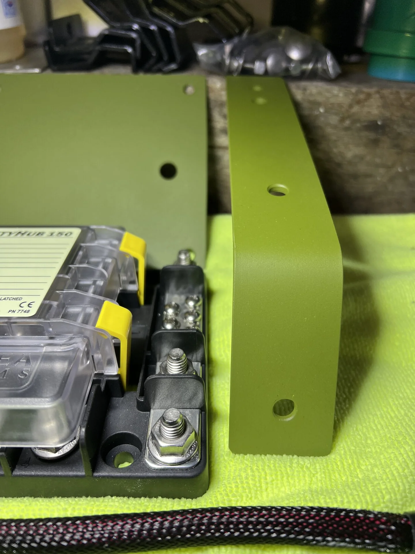 Rarely do I stop in my tracks and undo everything but going a different direction with type of Blue Sea nest. The fuses and the breaker are temporary so I can make sure everything upgrades without issue. The safety 150 Blue Sea is a fine box but once you get all the wires laid out it looks worse than before. So I built a small tray today painted and inital laid out the boxes. The breaker in the inline is to try out the slot style for my fan. It has a 25amp inrush and operates under 20amp. This is a 30amp continuous and pretty handy. Only issue I see is the blades v. bolt down. I’ve got the MIDI fuses paralleled until I trust them.
