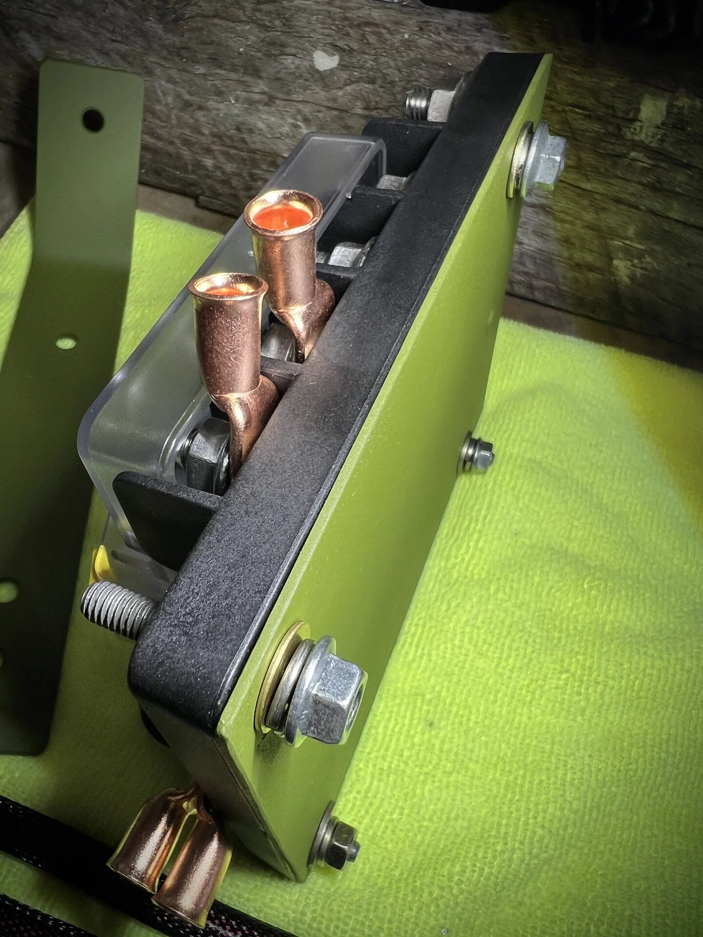 Close second we’re these little Mini ANL MIDI boxes. Small footprint, not watertight but easily tuck up in wherever you need them. Stay back! Think this label was appropriate, tightening the last bolt for the day and shorted my metric 12 box wrench on the post. Got sloppy and was dinner time