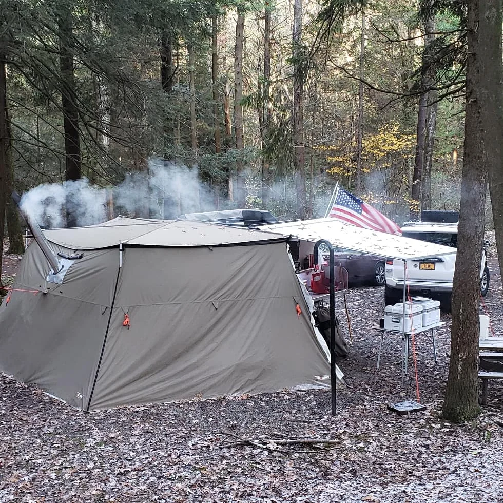 In the colder campouts, I sewed a stove jack in the sidewall...and it becomes my bedroom with a woodstove for 4 days.