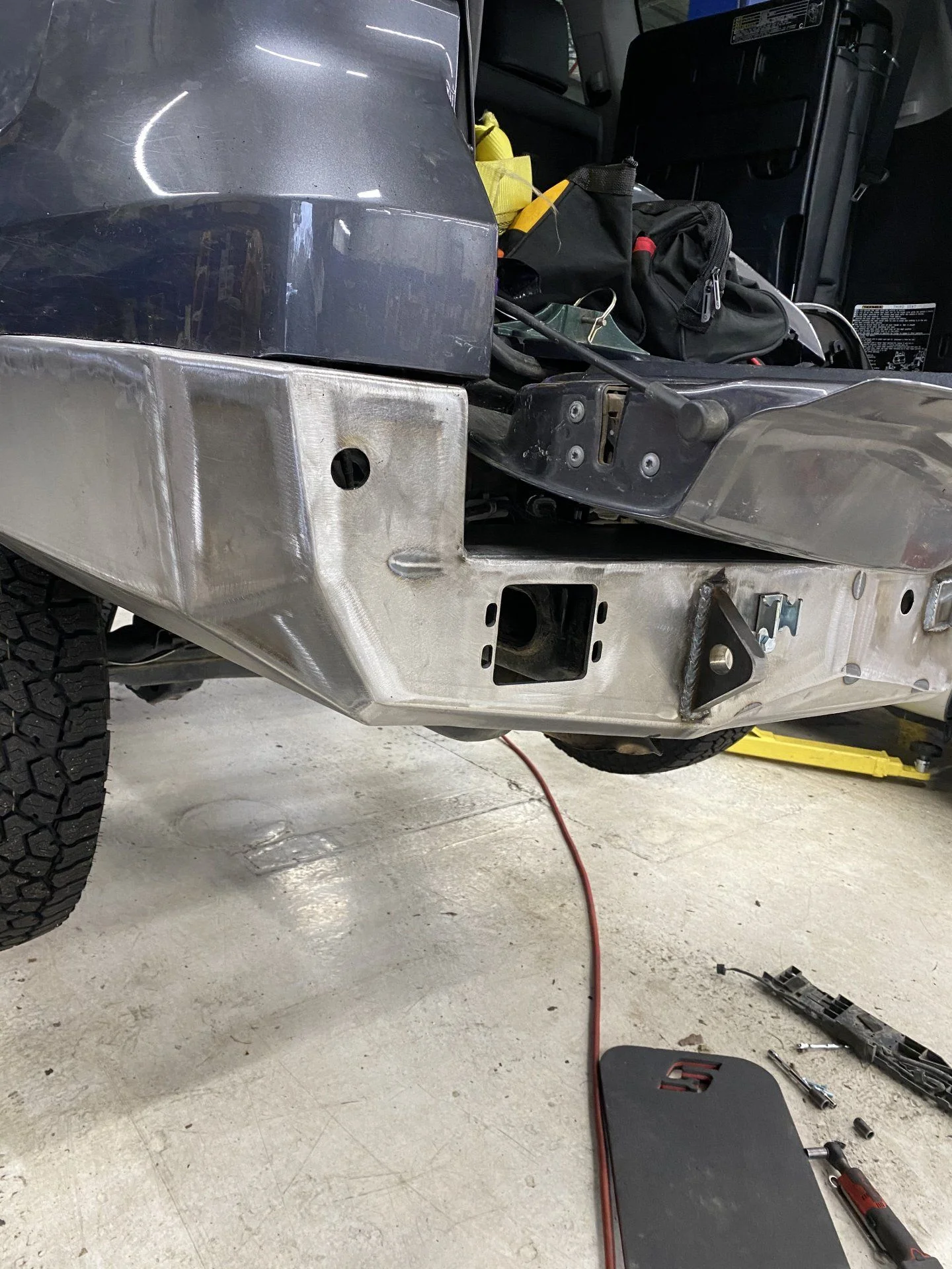 RLC Weldfab rear bumper. Painting tomorrow. Jerry cans coming from Amazon by 1/27. 5” lights eBay in a week. Sending James pictures. Pretty sure it will look better with a propane tank holder on one side replacing a Jerry can holder. I’ll probably get him to make me a 2 in one Jerry can holder. Thank you KLF I did double check that clearance!