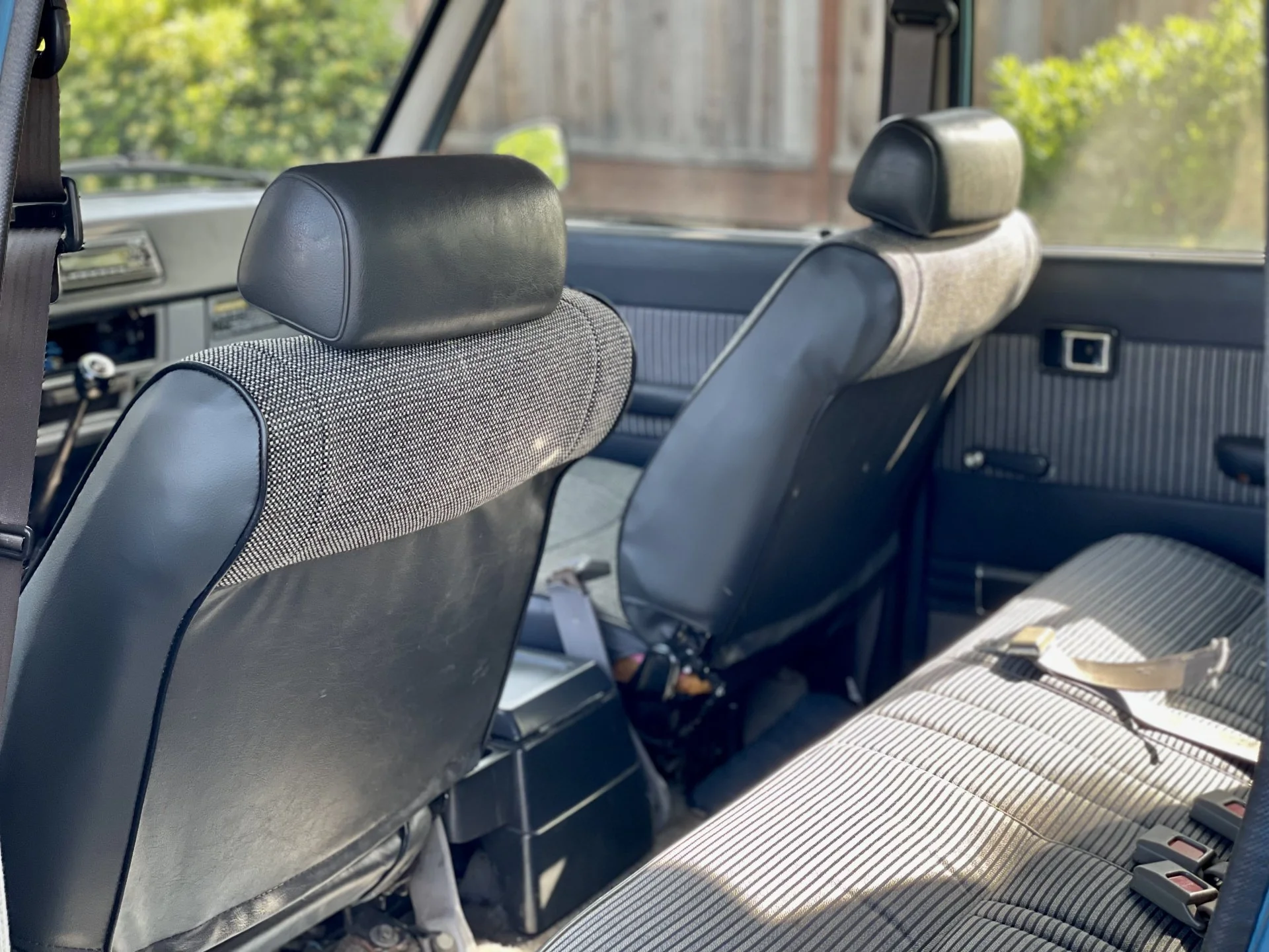 Interior door panels are in good condition with no tears, stains or rips; rear left window crank is missing. Rear tailgate carpet panel is missing. Headliner is in good condition - a few scuff marks are noticed that can be removed with a steam cleaner. Glass in good condition with small chips on windshield expected from a vehicle this age. Moldings are in ok condition and intact. Dashboard has several vertical cracks with the center blank panel missing. An aftermarket CD/FM player with speakers is operable along with an HVAC system. AC doesn't work and I was told it needs to be pressurized. All controls and gauges work. The front seats have been reupholstered with an aftermarket fabric. Driver side sun visor is missing. Rear hatch shocks are weak - a replacement set will come with the truck. Seat belts are in good shape all around.