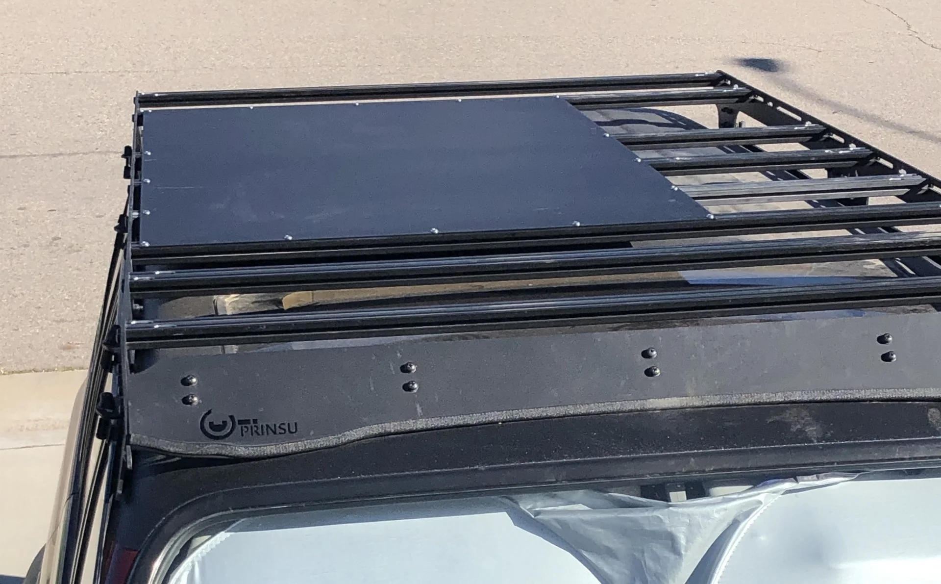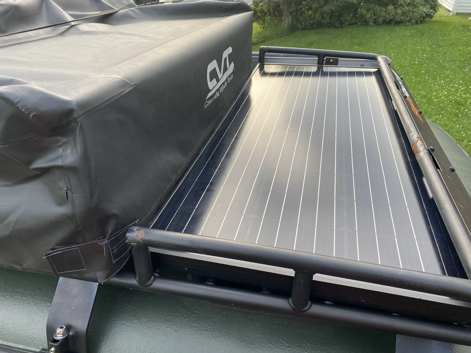 A quick way to improve your setup would be to elevate the front of the panel so it's inline with the top bar on the rack and then angle it up (raise the side that meets up to the tent) so it can fit in that space. This will also give you the added benefit of being able to park with the panel directly facing the sun at a more appropriate angle, which will further increase it's yeild.