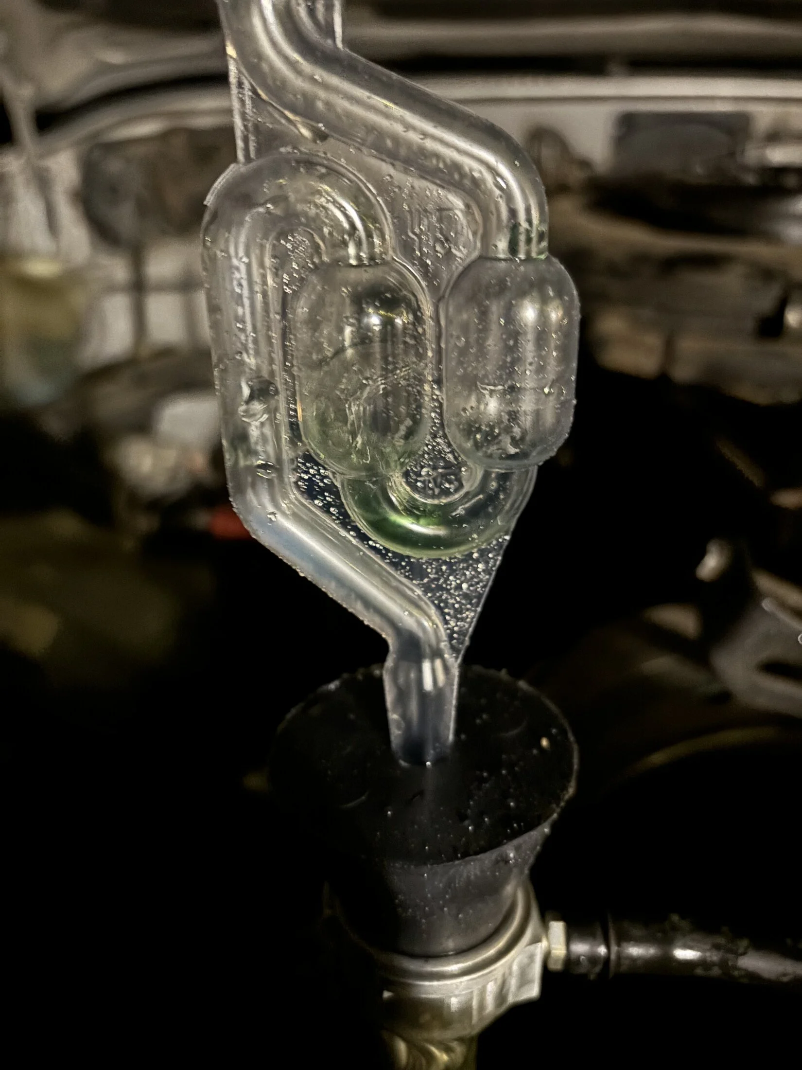 I had the head machined and checked for cracks when I first got it but I’ve always had a sneaky suspicion the head has a crack in the combustion chamber somewhere. This morning I had some time before work so, motivated by @Roastchestnuts recent post, I used one of those head gasket checking fluid tools. Says let it warm up, etc but within a minute the fluid turned yellow meaning cracked head or bad head gasket.