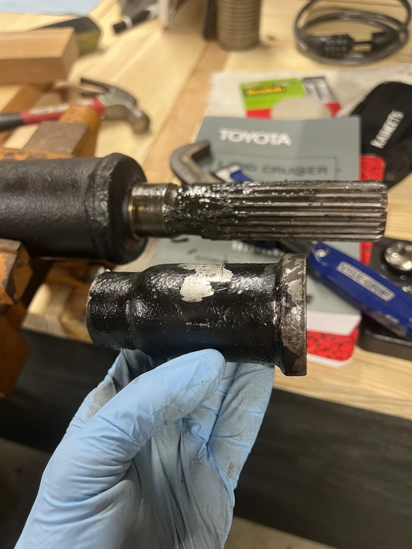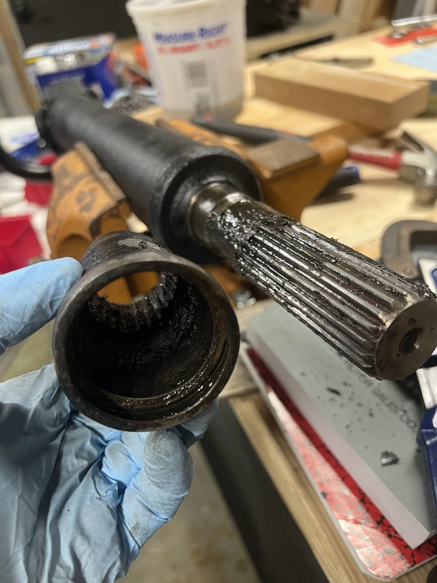 Only have a pic of the metal retainer clip and the form seal below but after removing drive shafts during transmission/transfer case pull (a whole nother story coming soon…) I noticed the metal retainer was all bent and when I pulled the slip yoke apart the felt was torn in half and stuffed in.