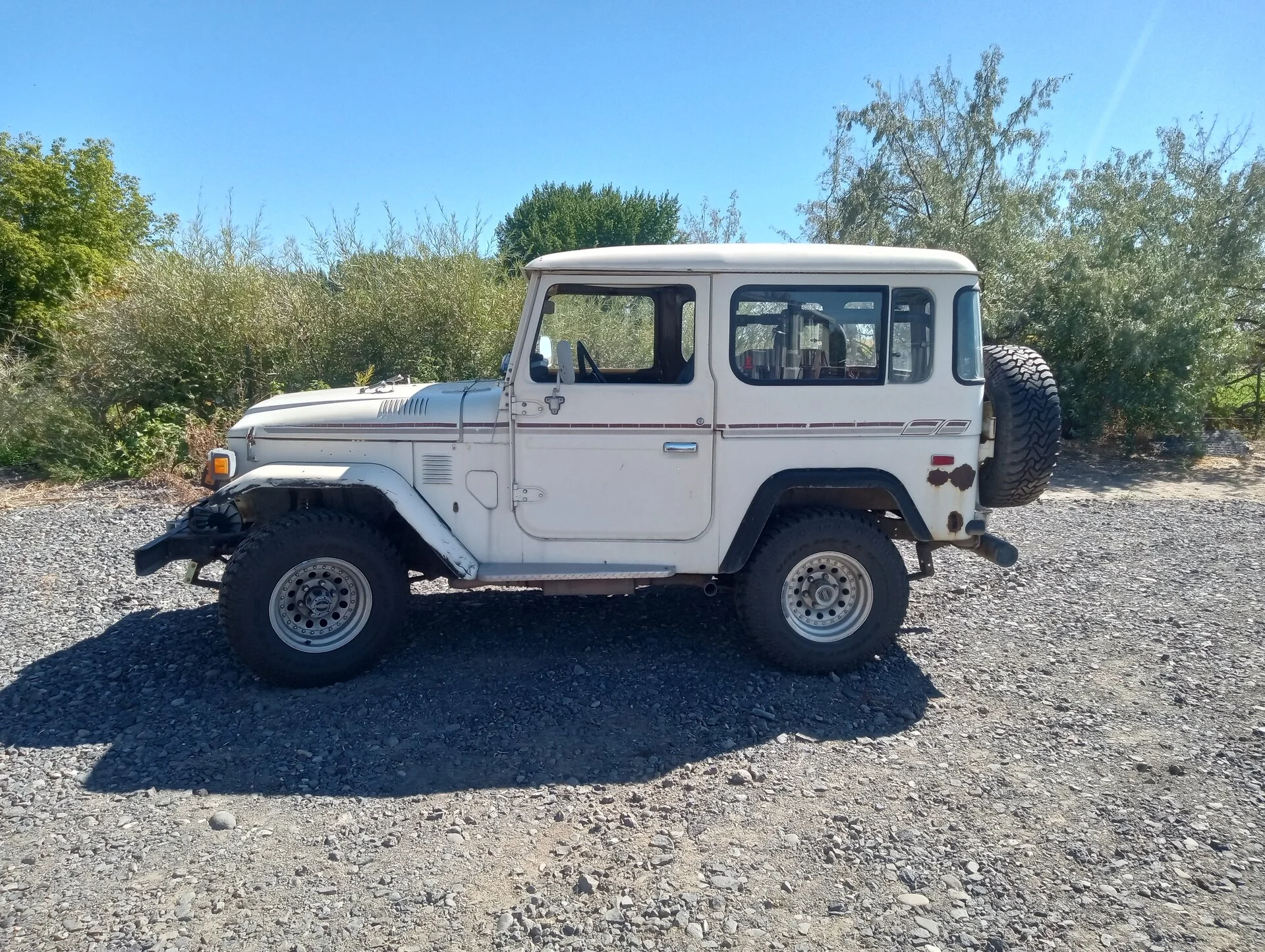 1978 with recently installed '78 2F (June 2024). New valve stem seals during engine swap, no smoke at start up or running. Daily driver condition. New brakes, wheel and axle bearings, knuckle and steering components. New seat upholstery. Lights, signals, gauge cluster all in working order. Included with sale, many OEM parts to return to original; EGR heater, carb, air filter assembly. Tires 3 years old (less than 2k miles) Excellent frame condition; with some standard FJ40 body rust. Clear Idaho title in my name.