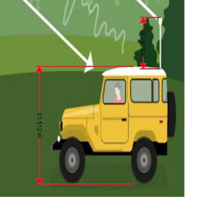 A fiberglass top does not provide a ground plane to the antenna. An antenna with a length of one half of the wavelength of the band it is operating in does not require a ground plane. Assuming that the antenna is a half-wave, we can deduce that it is ~13.75 inches long. If we then scale the image, we determine that the Land Cruiser is ~31.5 inches tall. A U.S. spec 40-series Land Cruiser is ~6 feet (72 inches) tall. The driver appears to be proportional to the vehicle, so we can deduce that they are ~3 feet tall, and therefore quite bad at basketball. You don't drill holes through an old fiberglass roof without consequences. That roof leaks.