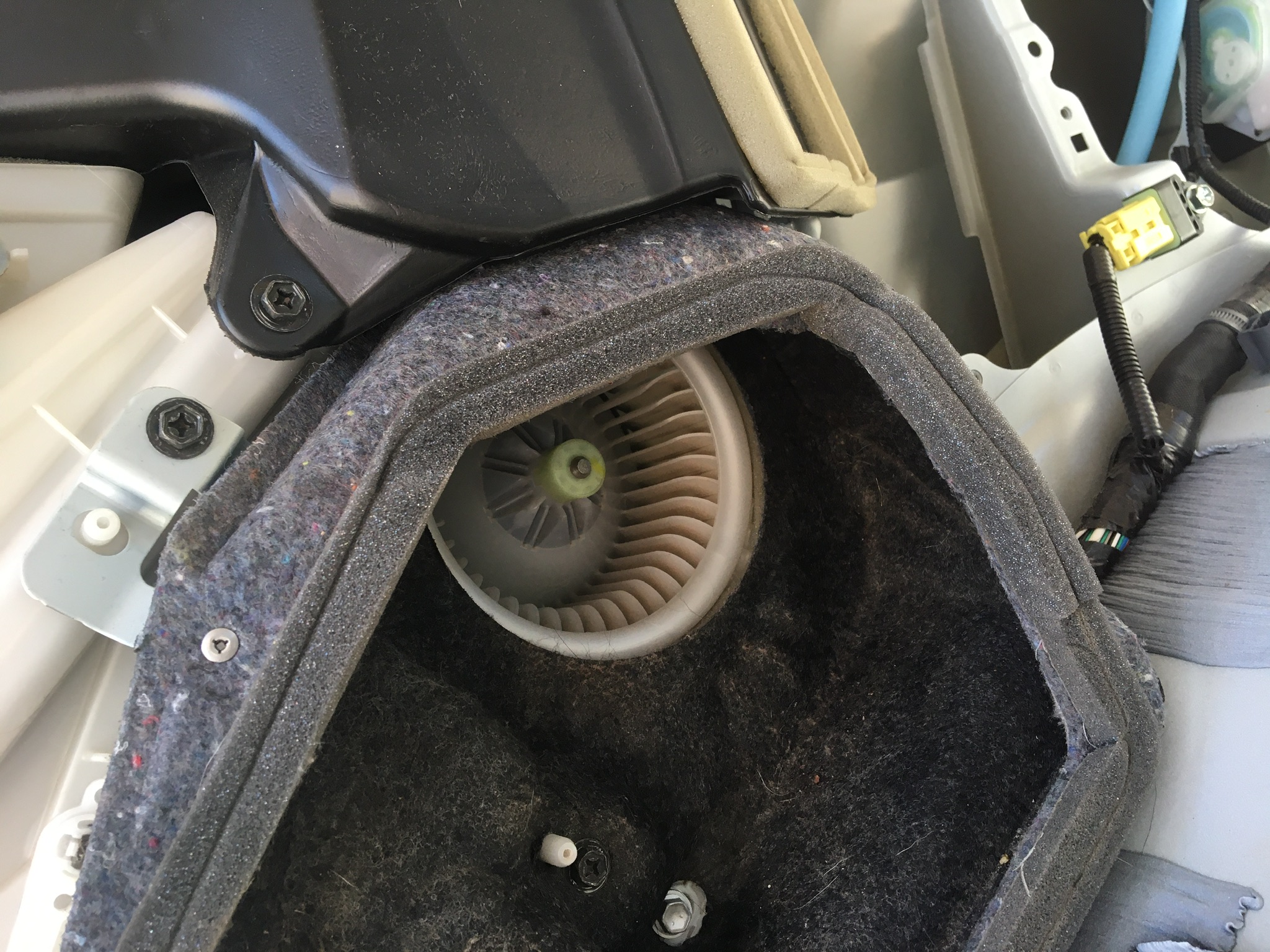 Like @bloc said, there is no filter. Though, as I understand it, the rear HVAC does not draw in fresh air from outside. Any contaminants would have to come from in the cabin through that grille in the trim. On the back of the grille, there are provisions to help keep things from being drawn into the fan(yellow circle in pic below), and the fan is mounted high in the duct. Aside from the stray leaf that made it to the fan, the intake duct was very clean.