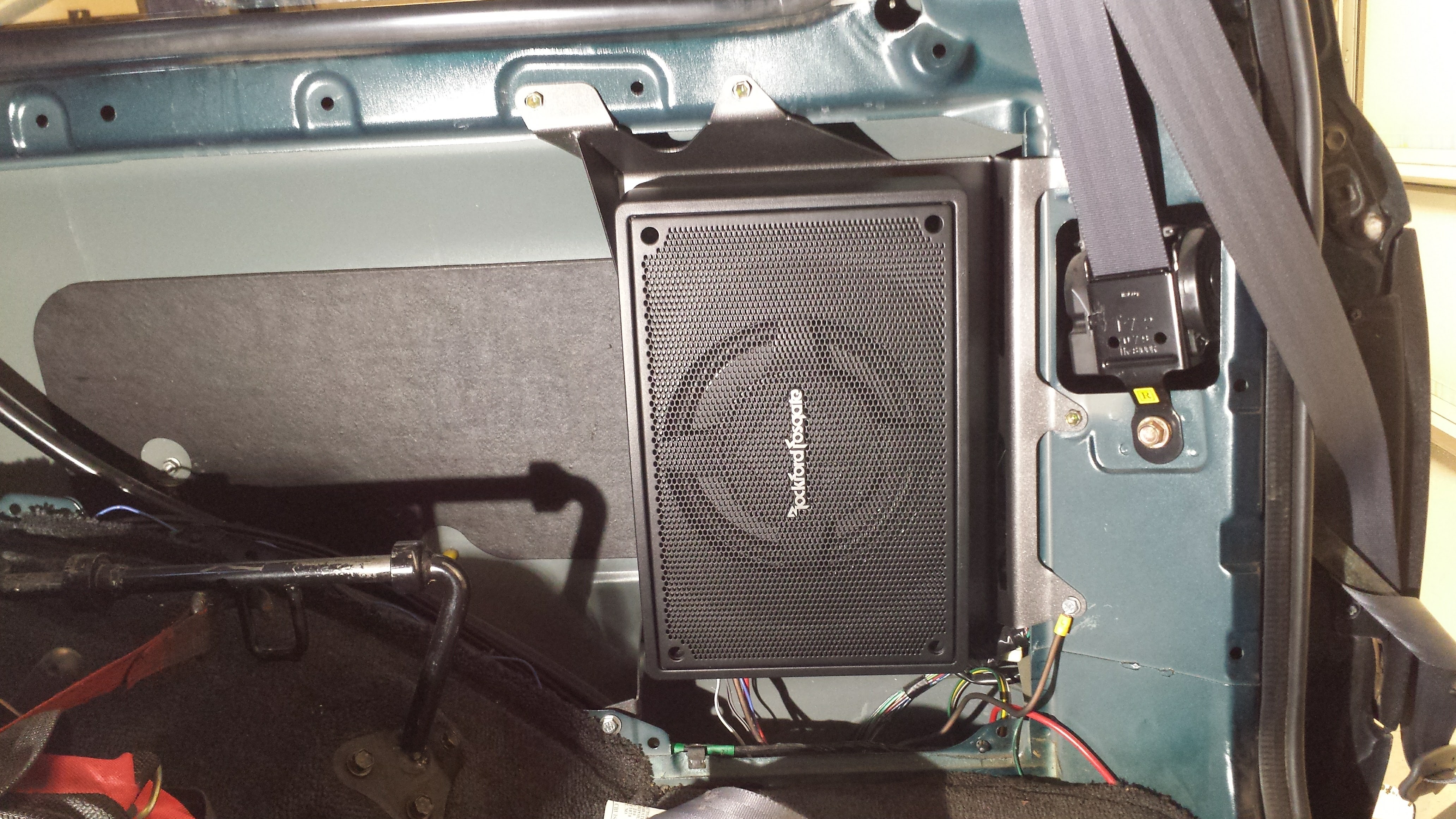 If you look close, you might be able to see it behind the factory speaker grill. You can also spot the "Rockford Fosgate" logo through the lower vent, but you have to put your head down by the floor and look up through the louvers to do so.