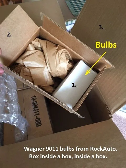 I just received a set few mins ago and this is how they were packed. It'd be better if they bubble wrap the bulb instead of wasting so much packaging. Oh well...Always get a laugh when RockAuto ships the Wagner (re-boxed Phillips ) bulbs. You get this huge box , with another box inside, with another box (the actual bulb) inside of that. I guess they REALLY don't want them to break.