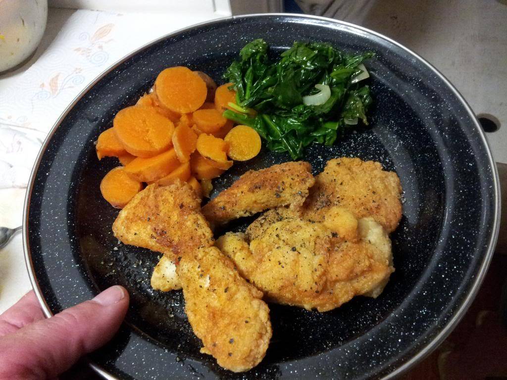 Sautéed pork medallions, carrots, mashed potatoes with cream gravy (bacon renderings used)