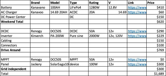 I'm also considering a much smaller all in one LiFePo4 powerstation. It is the limited on board inverter (300W/600Wp) that is holding me back (and of course total capacity). A lot of convenience for $370, but I don't think I want to have to haul around 2 or 3 in the long run. Good short term plan, maybe not great long term.