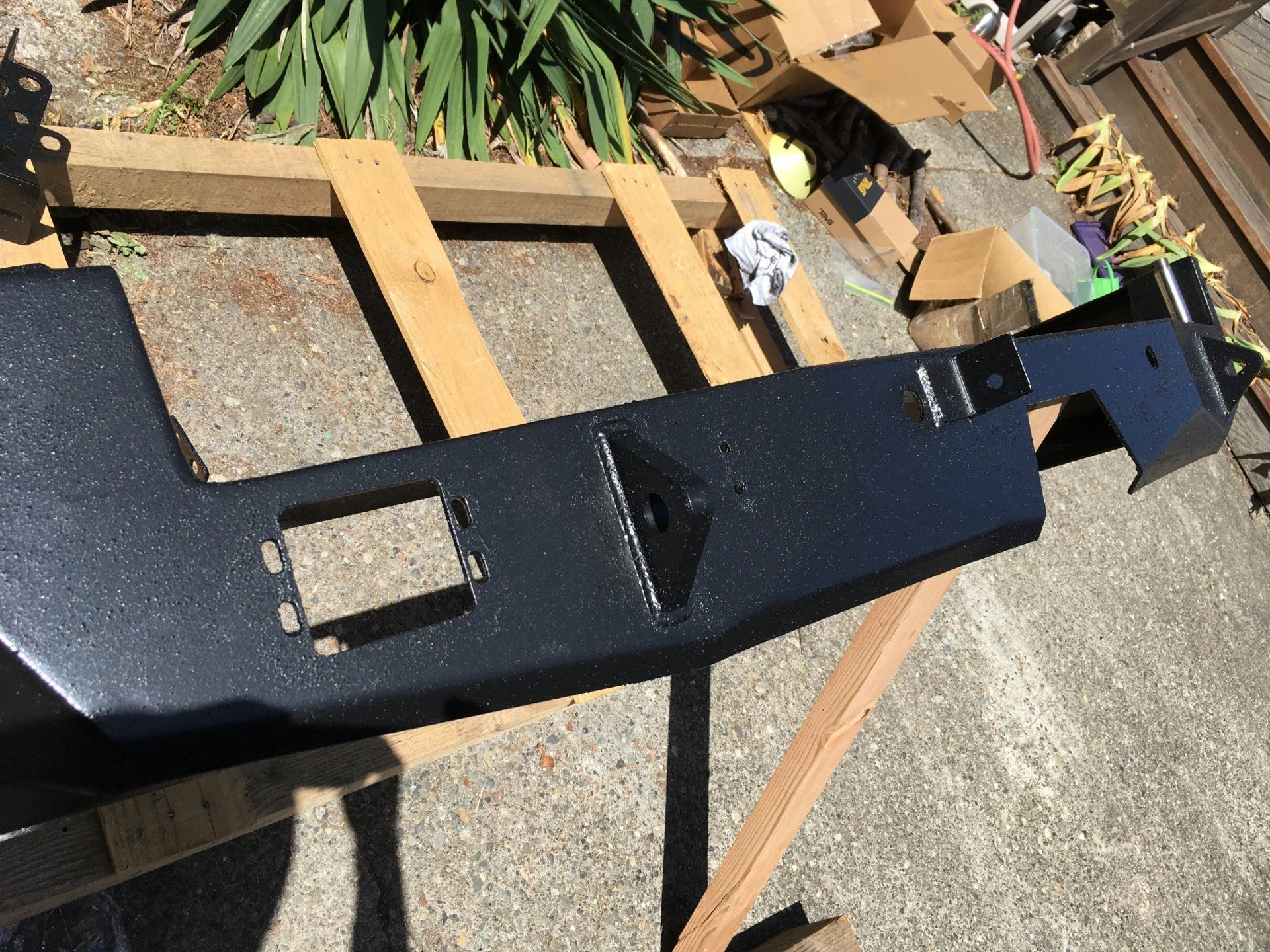 I got the the bumper and mounting brackets finished coating, took off the wheel well covers, and started coming to terms with the mounting of it all. Pretty straightforward, particularly if you have a TLC.