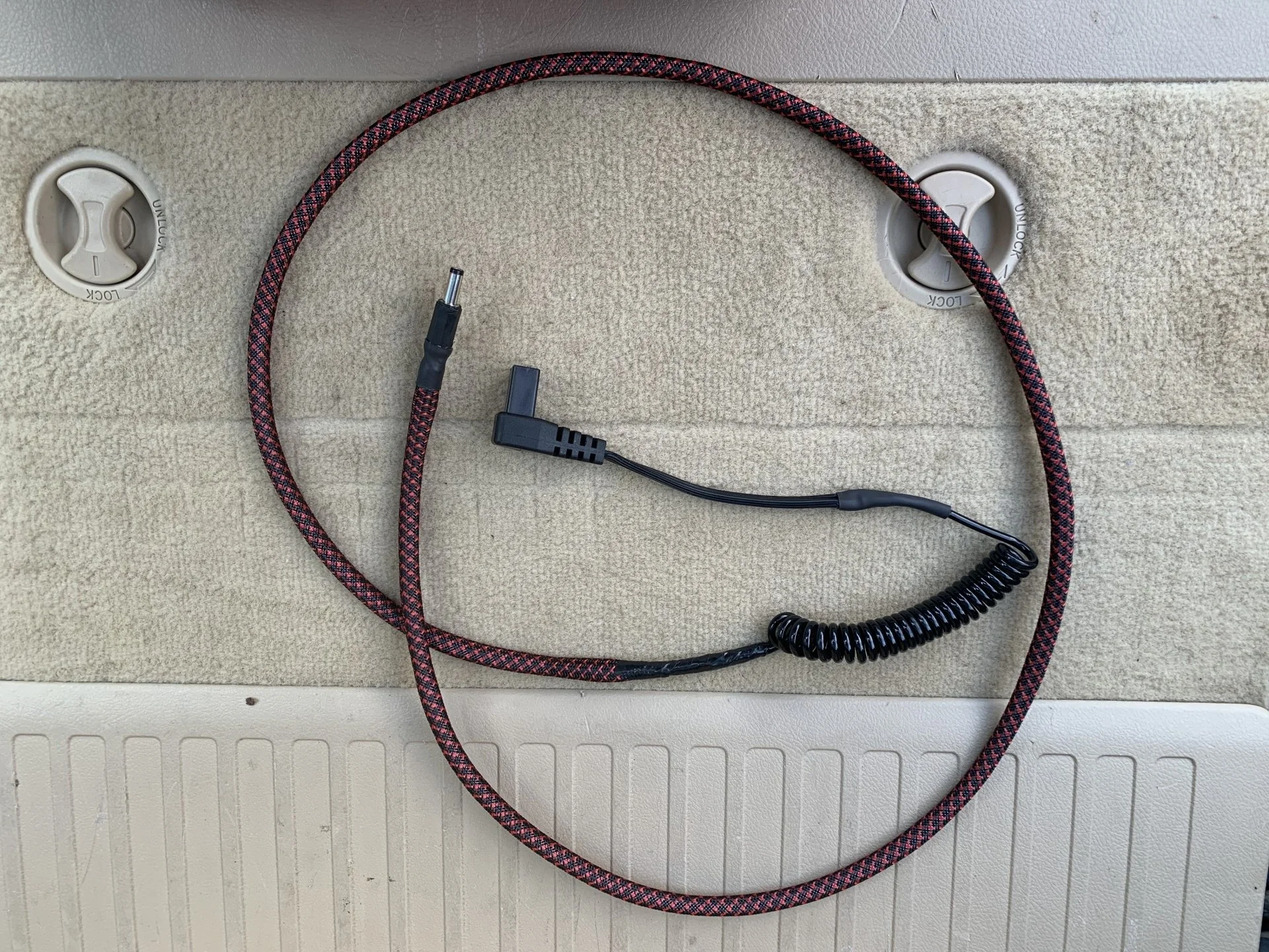 It had four parts. The special female end that fits into a 12v out on my battery /solar generator. Then some 14ga speaker cable. Then that coiled cable which stretches to 2 ft which I cut off a cigarette lighter plug, then the special end from my fridge 12vdc cigarette lighter cable. Soldered and shrink wrapped and then some cable wrap.