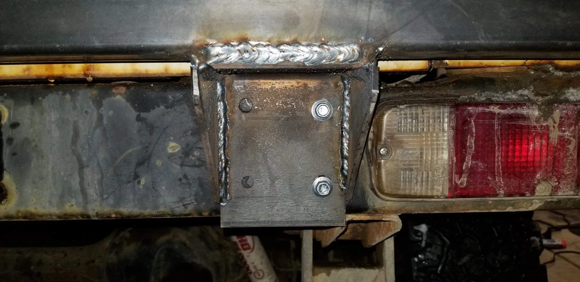 I also ended up tying the carrier into the frame in two more places, next to the lights. With the gussets, it really stiffened up and doesn't flex any more, even with a 120 pound tire hanging from it. The hinges are also doing really well. They have no flex in them, which is perfect. I can flex the suspension with the carrier and the hinges don't care at all. There are supposed to be 2 more bolts in each side of the carrier, but I'm lazy and haven't felt like drilling the holes yet.