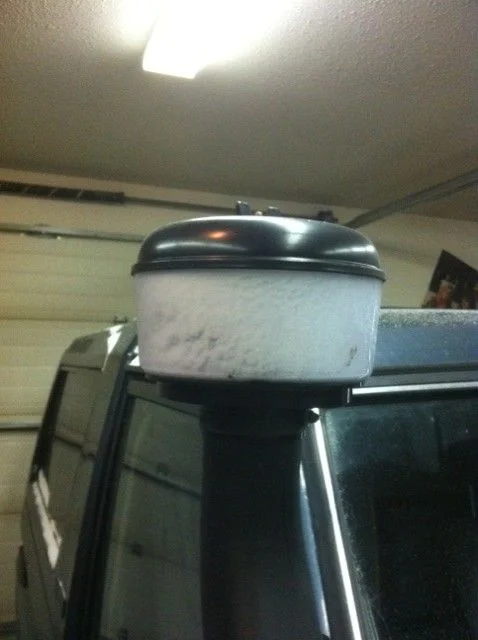 I decided to change it out for a precleaner style head and the results speak for them self. The second pic was taken after driving in an early morning ice fog at about -15*C. It was not snowing at all. You can see how much frost the pre cleaner captured.