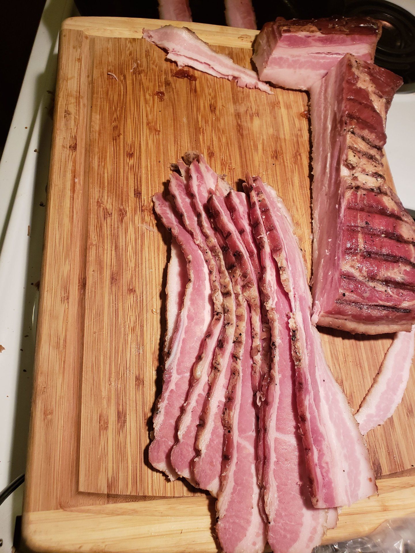 Here's what I was up to over the Christmas holiday. Brined 10lbs of pork belly. Did a little over half with a simple salt, brown sugar, curing salt brine and then did the other slab with the same brine and added maple syrup. Let them brine for 7 days, flipping once daily, then smoked with pecan for a couple hours at 250 degrees. Since I had the smoker going I cooked a 10lb pork butt too. That's how that glorious sandwich at the bottom came to be