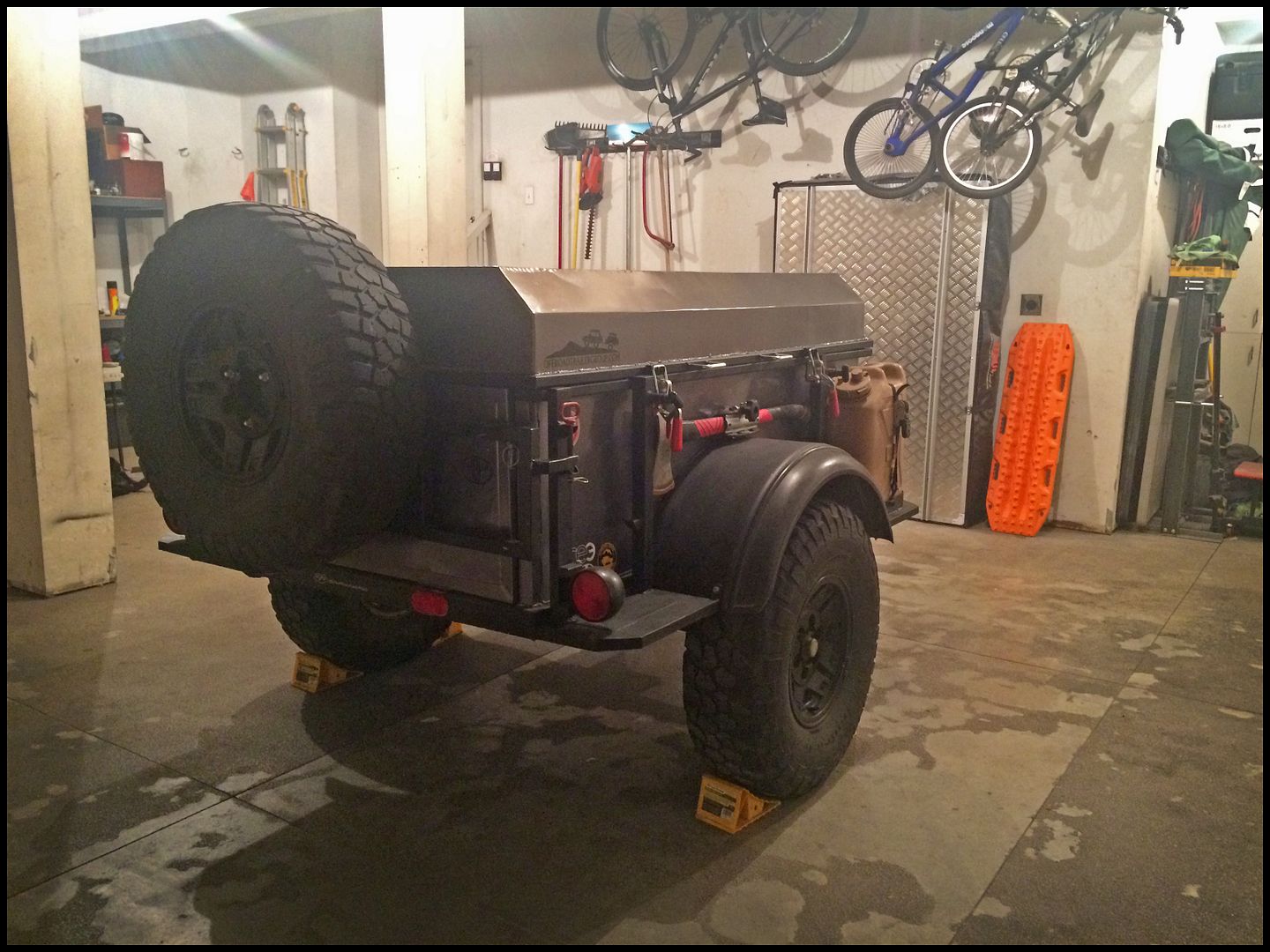 I wanted to add a 31 gallon water tank to the underside of the trailer so I lifted it. JJ's are really low slung and I made it 3" taller so this would work without hitting the axle. The matching wheels were a given considering some of the places we've gone.Matching wheels...