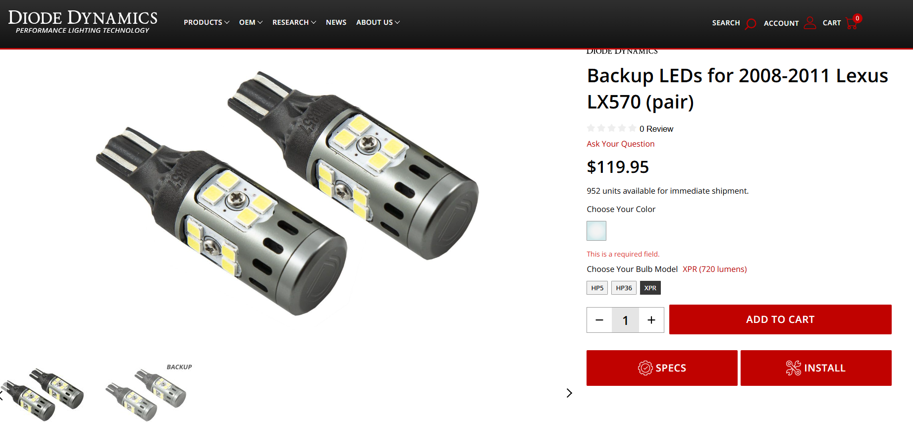 My biggest gripe is the image when reversing at nighttime - the stock bulbs seem plenty bright, but the image I see on the screen is all but useless. I did a little test with three 900 lumen flashlights, and the additional light certainly helps, but I don't think I can find replacement reverse lights with anywhere near that output. Any thoughts on improving screen image/camera resolution? I've looked at swapping the camera itself too but haven't uncovered anything. To anyone who's replaced the reverse bulbs, did you notice much imrpovement? I am considering these XPR LED's from Diode Dynamics...but it's a lot to spend on reverse bulbs if they're only going to provide a negligible improvement.