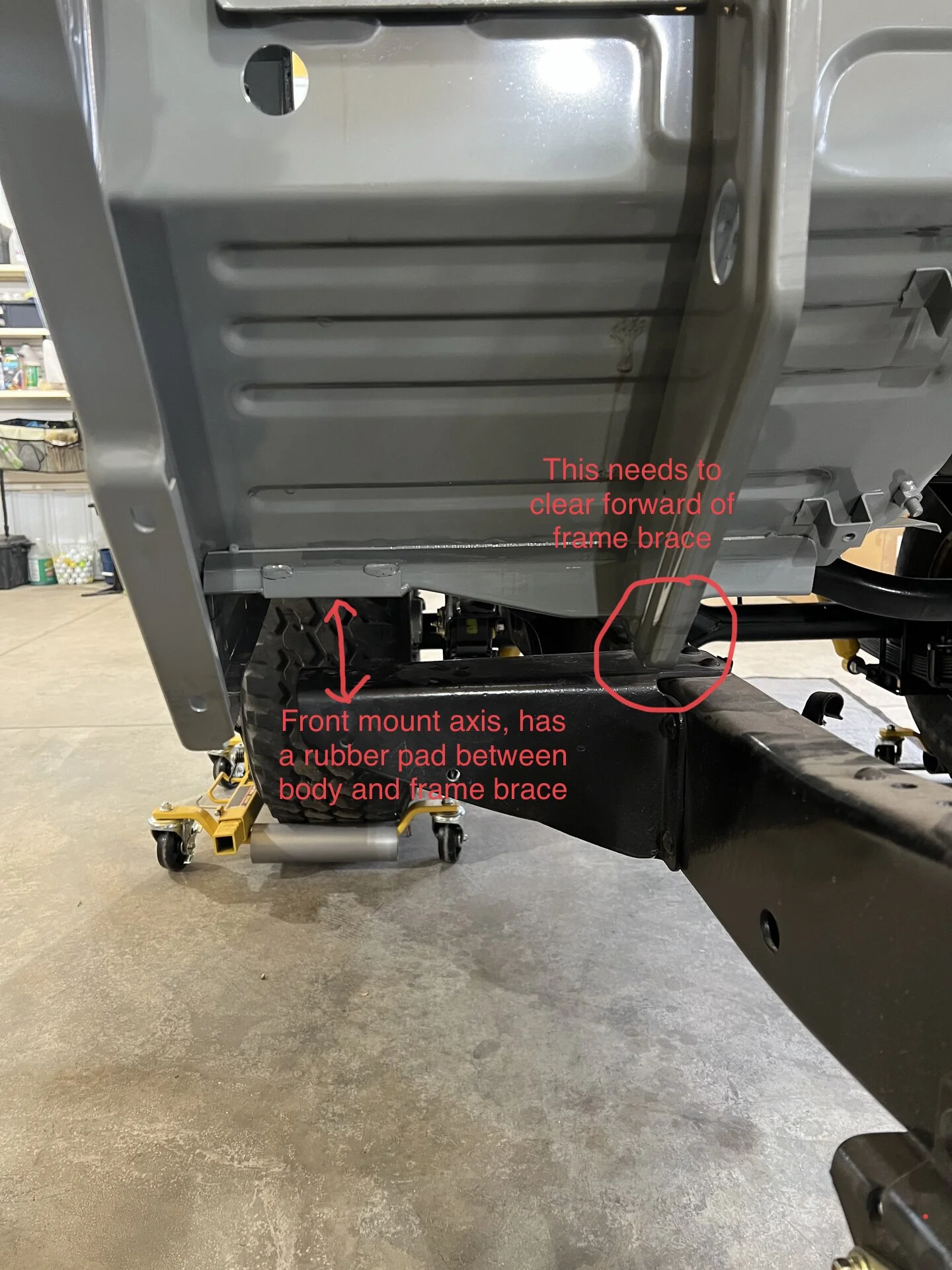 @Papa Rich what happens if you set the tub in place with front body mounts sitting on (there will be a gap for the rubber body mount pad) the body mount support? Where do the aft body mounts fall wrt to their frame mount locations.