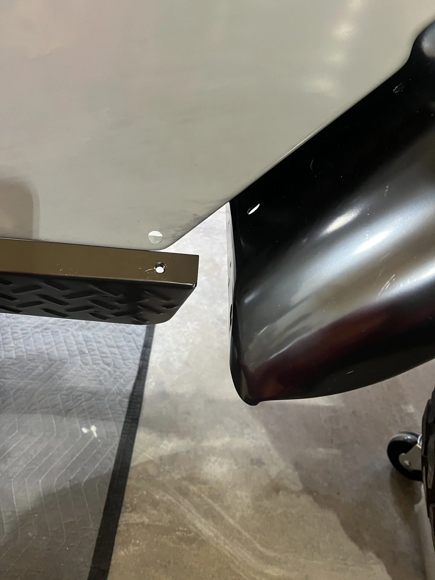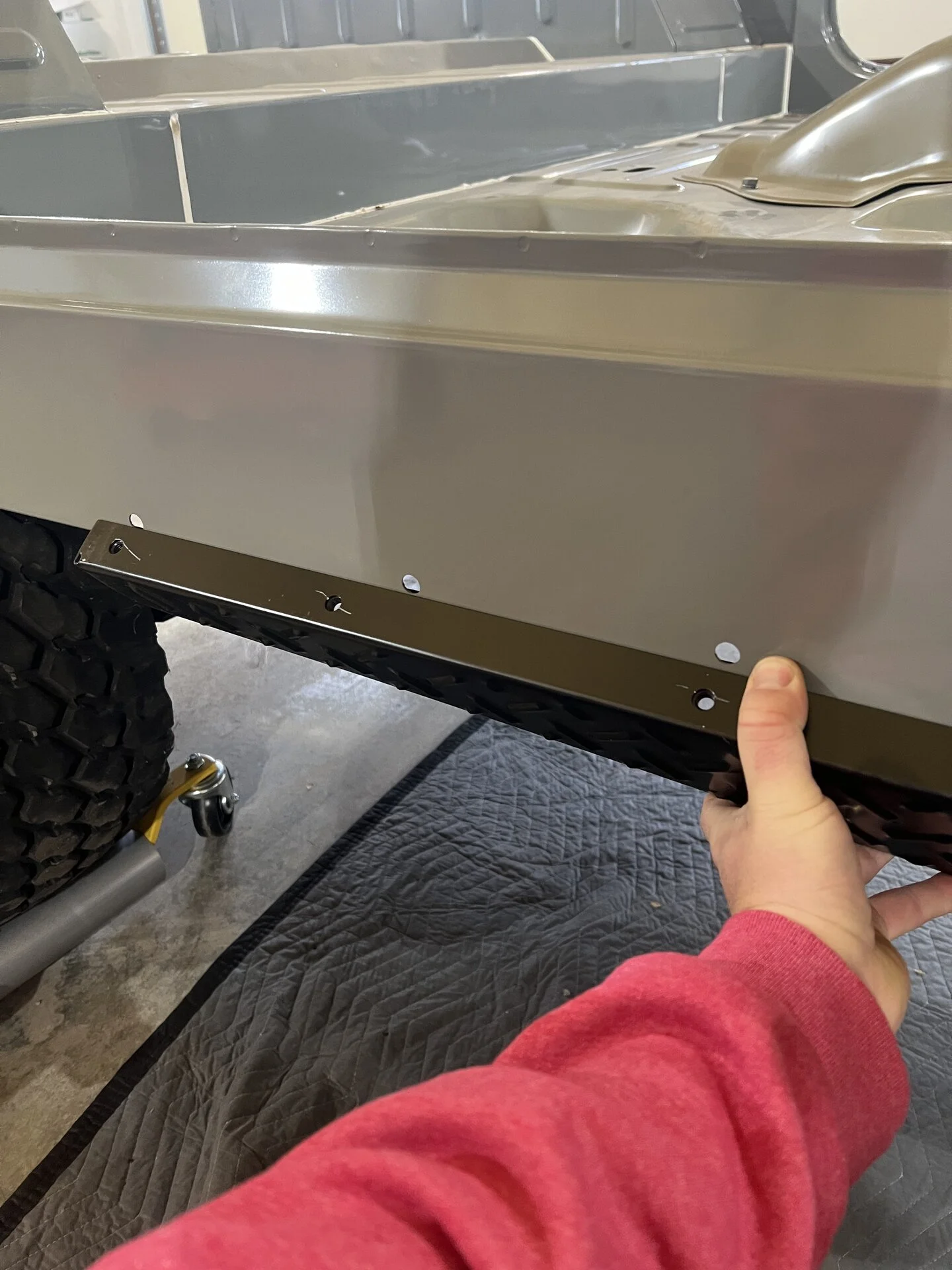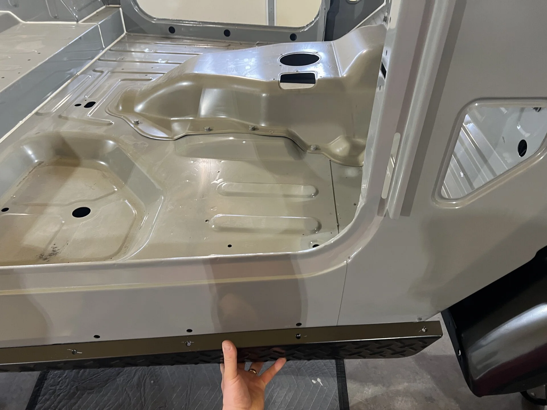 Here are some pictures of the body mount locations. I also held up an oem step to show how off the pre drilled holes are. If this is simple thing is off , how many other things will I run into? So disappointed in the fab and body work it’s going to require. I’m wondering if they have ever even set one of these on a frame. The pictures look great and the whole body kits are shown bolted together but never on a frame. The mounting hole for the body through the rear floor has a welded nut…why??