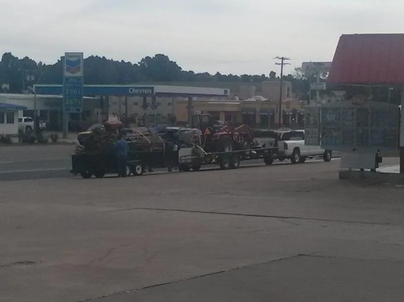 fountainhead said:Tandem trailers somewhere in East Texas. It's hard to tell in the pic, but that's a riding lawn mower strapped to the top of the rear trailer.
