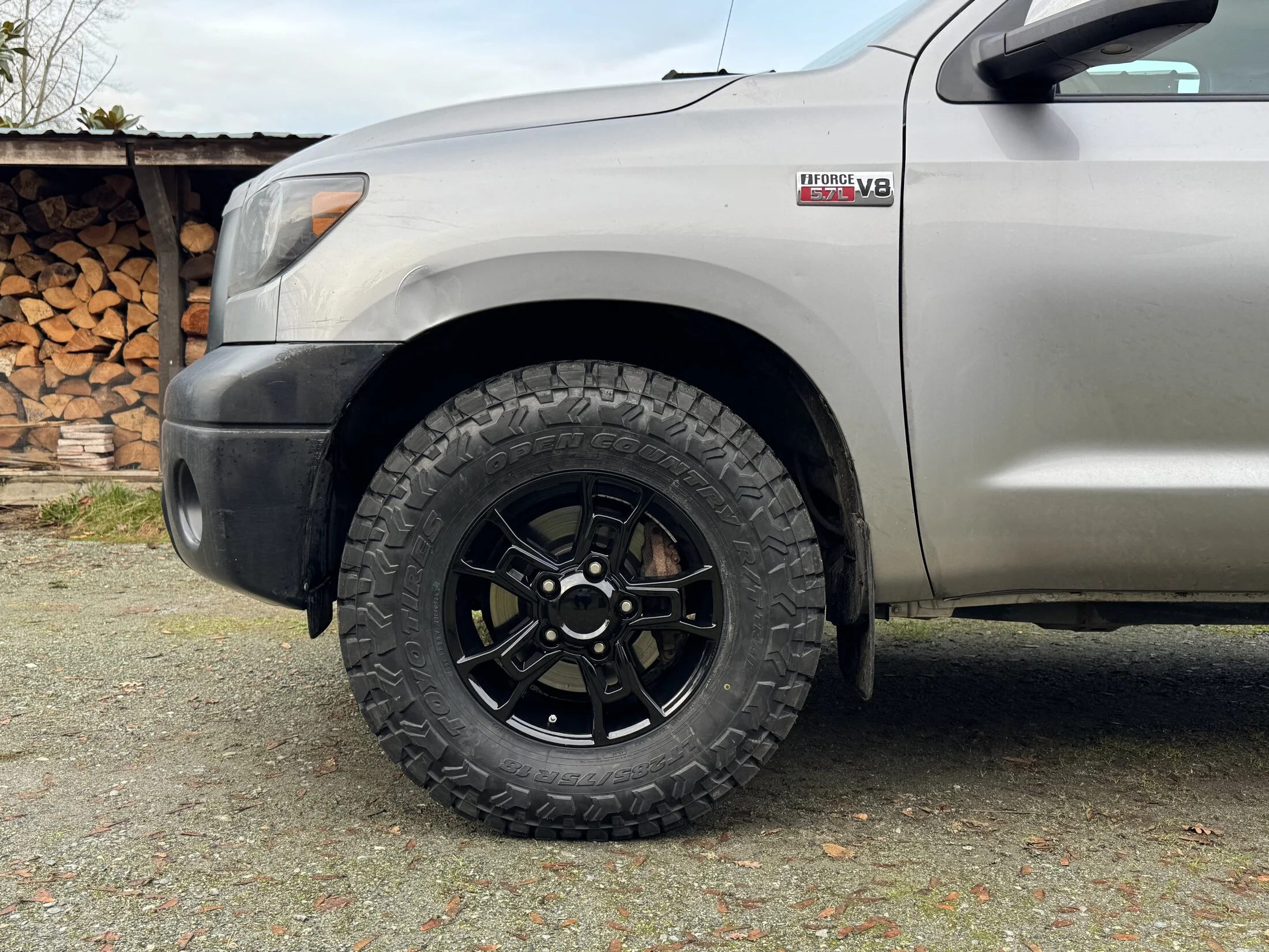 Tundra got new wheels. Toyo R/T Trail 285/75R18. They balanced easy. Bit stiffer on the wheel but smooth at speed. Gonna lower the back end a few inches to make it level. That’s next. Just a hair inside the fenders That’s the best part View attachment 3781440View attachment 3781441View attachment 3781442