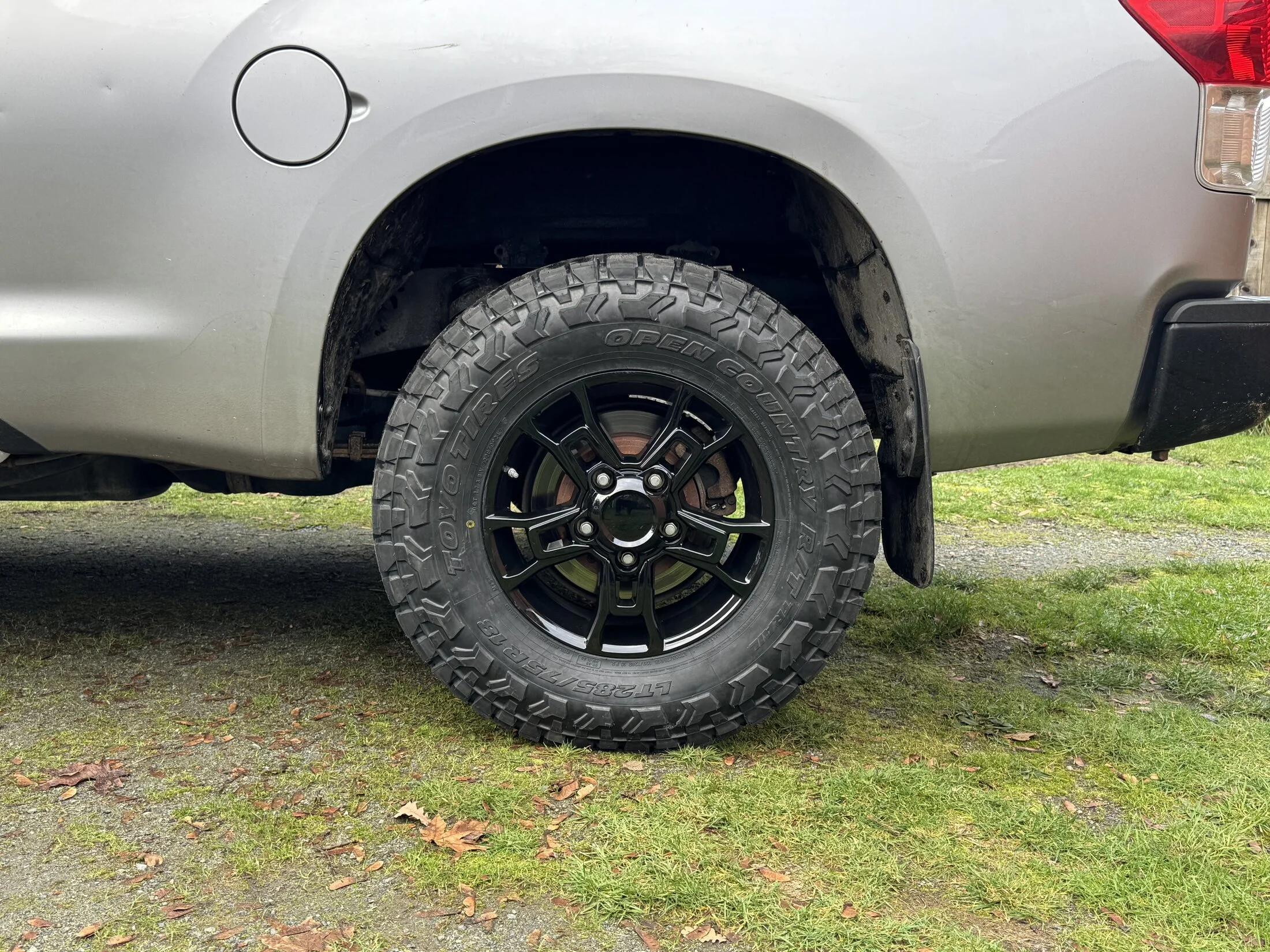 Tundra got new wheels. Toyo R/T Trail 285/75R18. They balanced easy. Bit stiffer on the wheel but smooth at speed. Gonna lower the back end a few inches to make it level. That’s next. Just a hair inside the fenders That’s the best part
