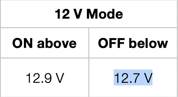 However, the BCDC (and other DC-DC chargers) have an ignition sense wire, just for this scenario! To start, let's be lazy and connect the ignition sense wire to the 12AWG wire that's carrying power to the BCDC. The threshold for the ignition sense input is 12V. Since 12.075 volts is just barely above 12, if there are higher resistances that we've not accounted for in our model, the trigger would fail. I don't like those odds.