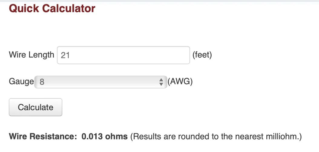 For these purposes, I'll assume the battery charger wouldn't live on your bumper or the trailer tongue, so We'll re-use the 0.033 ohms for the 21 feet of wire from the calculations on the previous "directly wired" setup.